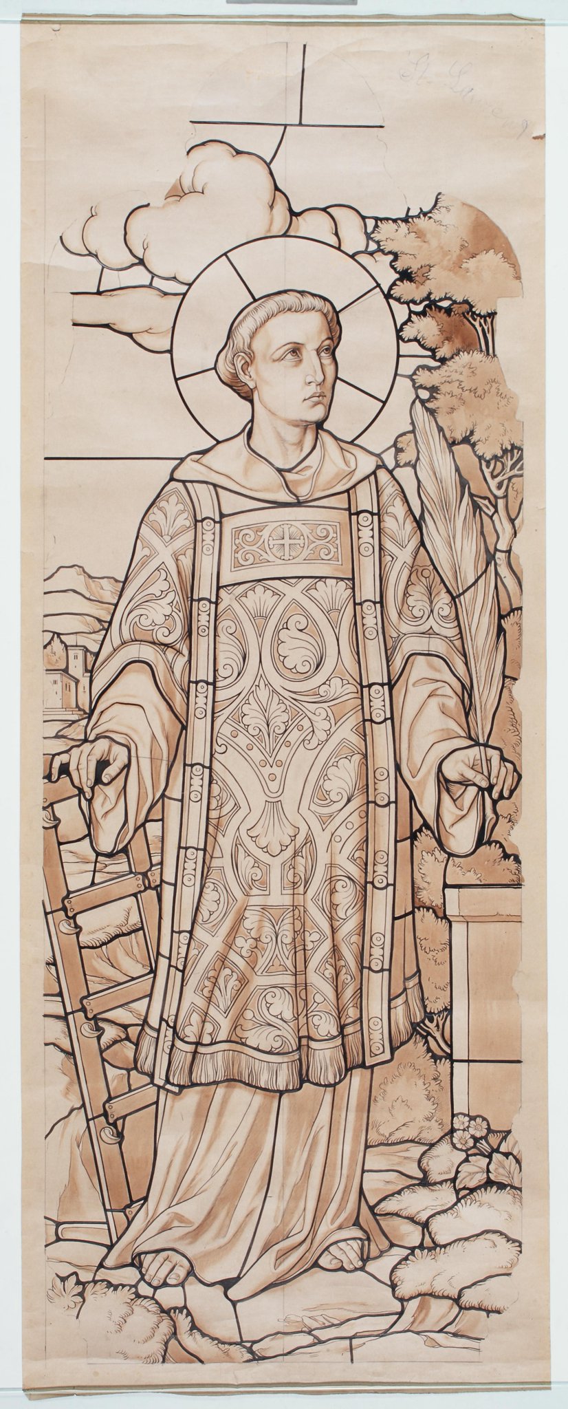 Ce carton, en noir et blanc, est le modèle précis et à l’échelle 1:1 de la partie figurée gauche du vitrail consacré à saint Laurent et sainte Elisabeth de Hongrie pour le transept gauche de l’église Saint-André à Onnens. Toute la partie décorative manque mais la forme trilobée de l’ouverture est indiquée avec précision.