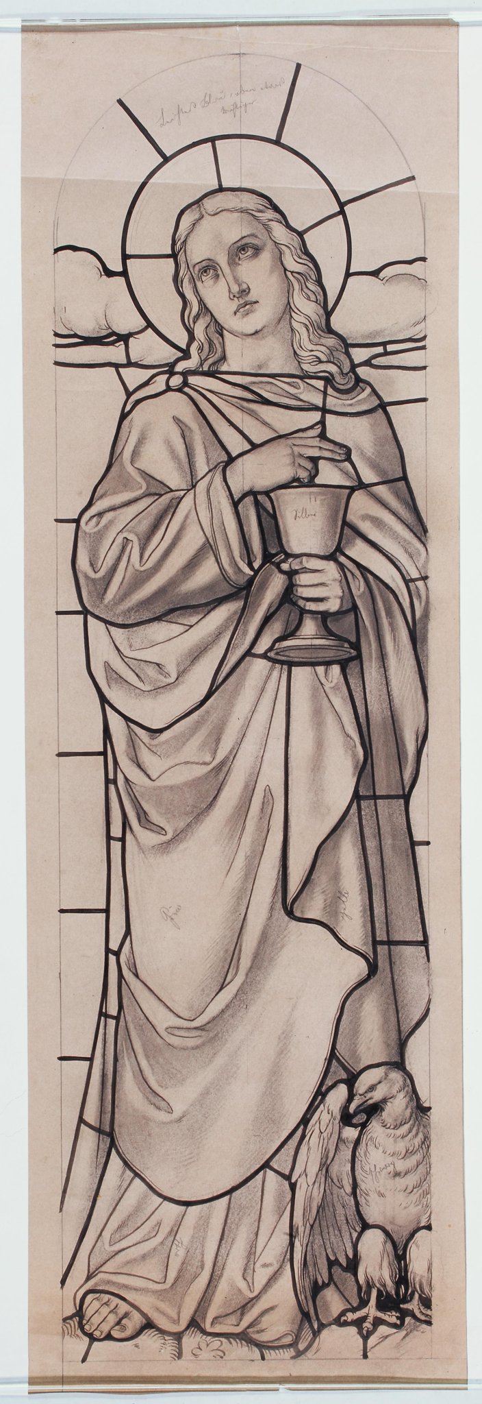 Ce carton en noir et blanc illustrant Jean l’Evangéliste est le modèle précis à l’échelle 1:1 de la partie figurée droite de la fenêtre axiale consacrée à saint André à l’église Saint-André à Onnens. Toute la partie ornementale manque.