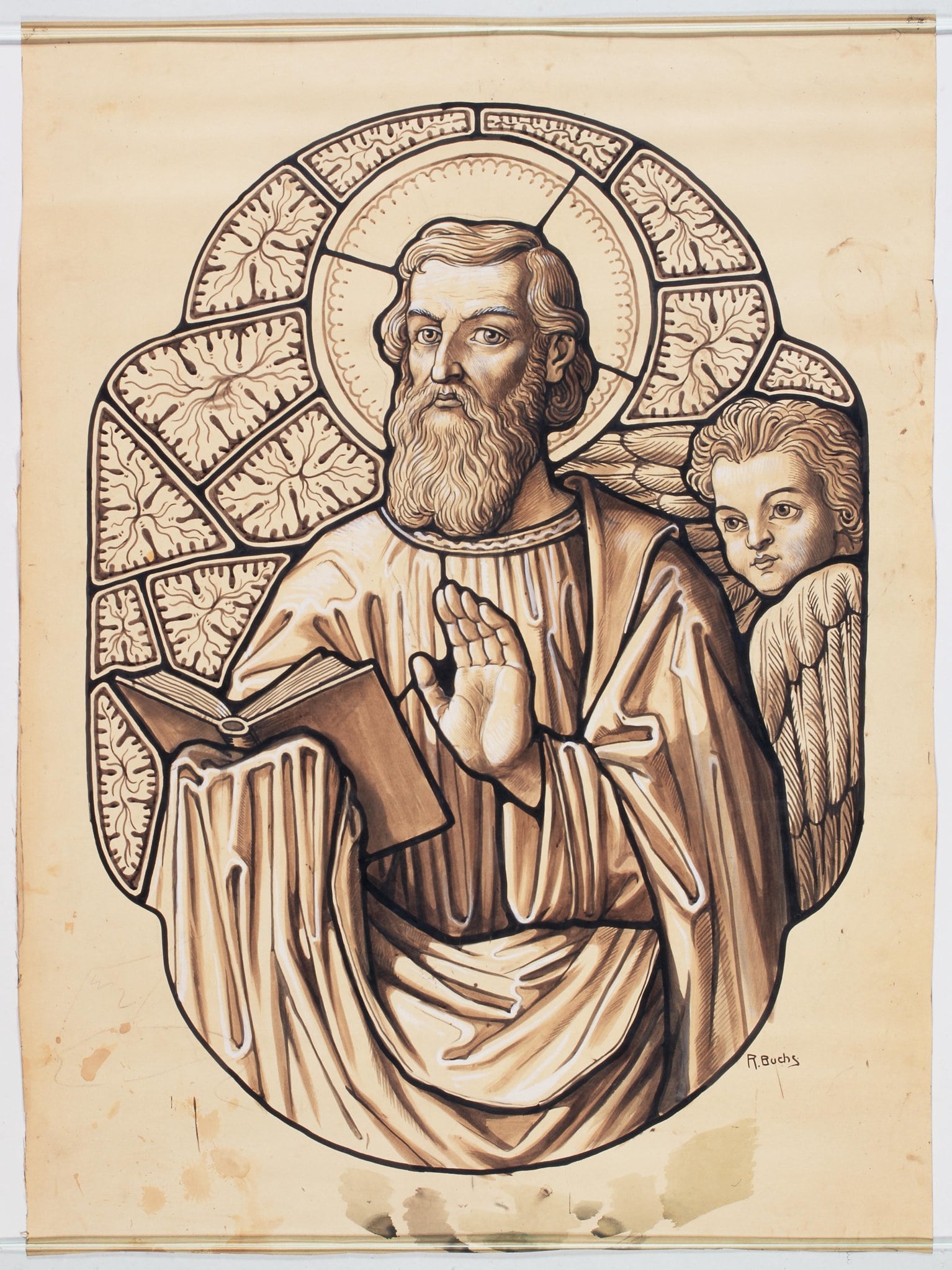Ce carton en noir et blanc est le modèle précis à l’échelle 1:1 de la partie figurée du vitrail consacré à saint Matthieu pour a fenêtre droite dans le transept gauche de l’église Saint-Michel à Villarlod. Toute la partie ornementale manque et fait l’objet d’un carton séparé le KF_388.