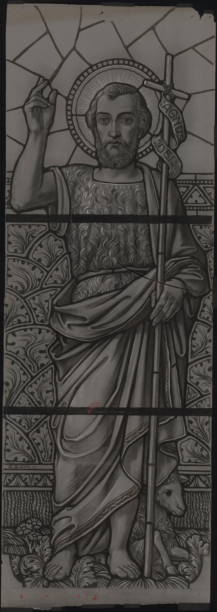 Saint Jean-Baptiste auréolé est représenté en pied, bénissant de la main droite et tenant un bâton cruciforme de la gauche, sur lequel flotte une bannière avec l'inscription "Agnus Dei". Un petit agneau est couché derrière ses jambes. Derrière lui se déploie une tenture damassée qui lui arrive à hauteur de la tête. Ses pieds reposent sur un tapis végétal composé d'herbes et de fleurs.