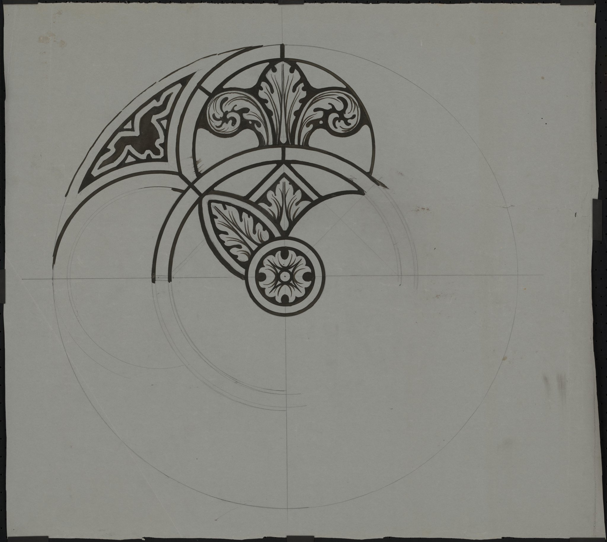 Oculus composé d'un mélange d'ornements végétaux et géométriques, rayonnant depuis le centre. Seule la partie supérieure gauche est dessinée.
