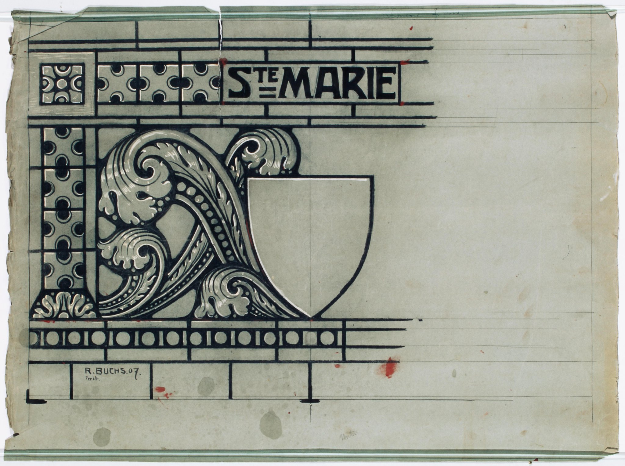 Ce carton, en noir et blanc, est le modèle précis à l’échelle 1:1 de la partie inférieure de chaque lancette pour les vitraux du choeur de l’église Saint-Jean-Baptiste à Grolley. Seule la partie gauche est dessinée, la partie droite se composant par symétrie sur le modèle à gauche.