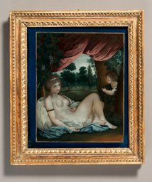 Unter schweren hellrot verblassten Draperien, die an Bäumen befestigt sind, liegt Venus halbaufgerichtet nackt auf weissen und roten Stoffbahnen. Sie trägt im hellbraunen Haar mit Ringellocke ein Blumendiadem, an ihrem rechten Oberarm ein Schmuckband. Von rechts neigt sich, auf Kissen gestützt, der geflügelte Amor zu ihr, die sich zurückwendet und sinnend ihren Zeigefinger an die Lippen führt. Vor ihnen liegen der Köcher mit Pfeilen und der Bogen. Hinten öffnet sich der Blick auf eine Flusslandschaft.