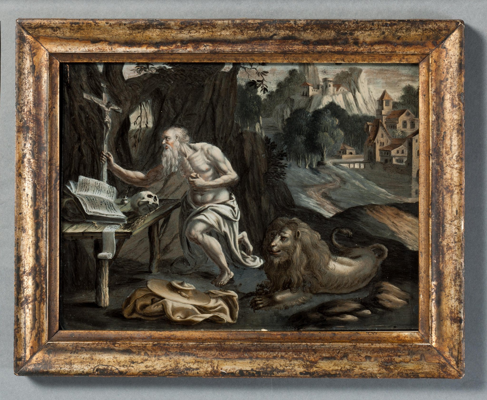 Das Hinterglasgemälde bildet zusammen mit den Bildern der hll. Arnulf und Spiridon PSV_801 und PSV_800 (Inv.-Nrn RY 888 und RY 887) den erhaltenen Teil einer Serie von Eremitendarstellungen, von denen jene mit dem Bild des hl. Spyridon (Inv.-Nr. RY 887) das Monogramm GM trägt. Das Bild des hl. Hieronymus entstand seitenverkehrt nach dem Kupferstich, den Jan I. (1550–1600) und Raphael I. Sadeler (1560/61–1628/32) nach einer Zeichnung von Maerten de Vos (1531–1603) für die 30teilige Serie der "Solitudo sive vitae patrum eremicolarum" 1585/86 schufen. Diese und verwandte Stichreihen der Sadeler waren bei Hinterglasmalern und Glasmalern sehr beliebt. Unter anderen haben sich von Niklaus Michael Spengler aus Konstanz (1700–1776) neun derartige Hinterglasgemälde erhalten (1996 im Kunsthandel. Auktionskatalog Koller 18.–20.9.1996. Zürich 1996. S. 22/23, Nr. 37 A-I.), während von Lorenz Lingg (1582–um 1639) vier Glasgemälde das Thema der Eremiten nach diesen Vorlagen aufgreifen (Schneider 1952. S. 414-420).