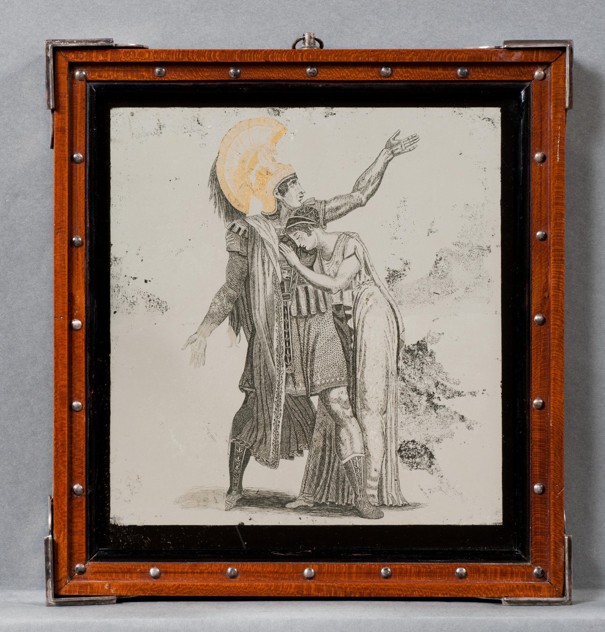 Der Abschiedsszene Hektors von seiner Gattin Andromache und seinem Sohn Astyanax wird in Homers Ilias grosse Bedeutung und viel Platz eingeräumt. Dies erlaubte es Homer, die guten Charaktereigenschaften des Haupthelden Trojas ausführlich hervorzuheben, um das künftige tragische Ende besonders zu betonen. Der Hinterglasmaler verzichtet hier auf die Wiedergabe des kleinen Sohnes. Das klassizistisch-romantische Spiegelgemälde besticht vor allem durch die Eigenschaften, die jedem figürlich verzierten Spiegel, aber auch jedem Hinterglasgemälde eigen sind: der Betrachter erkennt die Darstellung dann am besten, wenn nicht seine Person, sondern sich darin ein unifarbener Hintergrund spiegelt. Will er sich selbst sehen, wird er zu seitlicher Positionierung gezwungen, um neben der schwarzen Zeichnung des Hinterglasbildes sichtbar zu werden.