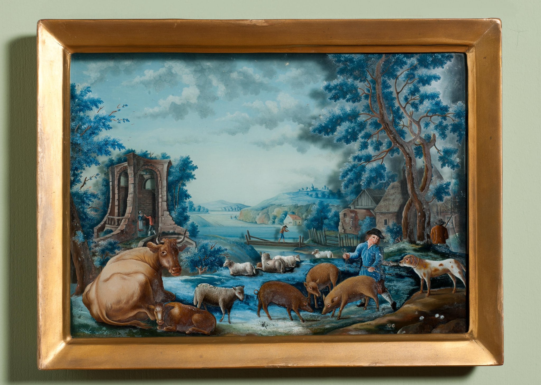 Den Betrachter anschauend und ins Bild einladend lagert vorne links eine Kuh mit ihrem Kalb, während unter dem wachsamen Auge seines Hundes von rechts ein Hirte Borstenschweine und weisse Schafe auf der Weide zusammentreibt. Im Mittelgrund findet in einer tempelartigen Ruine ein Stelldichein statt. Ein Feldarbeiter kehrt von der Arbeit über die Brücke zu seinem Hof zurück, in dessen Nähe unter Bäumen bereits jemand sitzt, der von einer Frau aus dem Fenster beobachtet wird. Im Hintergrund öffnet sich die Landschaft auf einen See, dessen Uferanhöhen von einer Kirche und einer burgbewehrten Siedlung besetzt sind. Die ganze Szene ist in blaues Dämmerlicht getaucht.