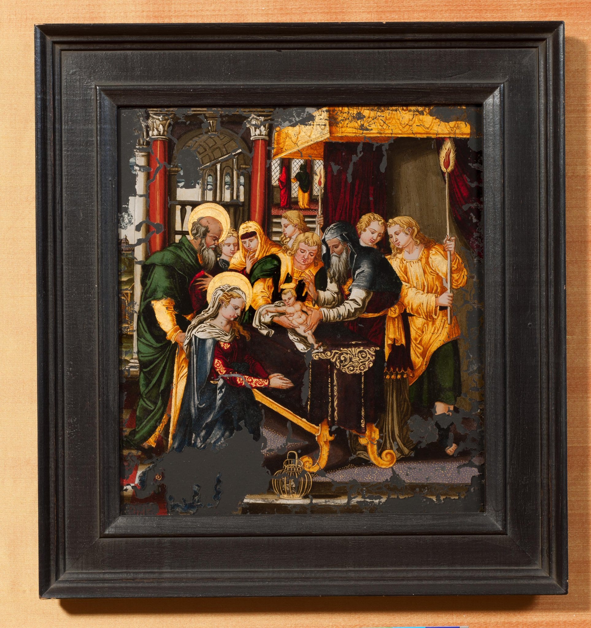 Da nach jüdischem Glauben das erstgeborene Kind Jahwe gehört, findet am 40. Tag nach der Geburt im Tempel das feierliche Darbringungs- und Reinigungsopfer statt (Lev. 12,6–8). Vorne links kniet mit gefalteten Händen betend die Mutter Maria in rotem Kleid und blauem Mantel. Hinter ihr steht im Profil der kahlköpfige, graubärtige hl. Josef in gelbem Gewand mit grünem Mantel. Er hat den Vogelkäfig mit den zwei Opfertauben auf die Altarstufen niedergelegt. Unter dem Baldachin nimmt der greise Hohepriester Simeon von einem Priester den Jesusknaben entgegen, um ihn als Erstgeburt dem Herrn zu weihen (Lk 2,22–24). Gleich wird er Jesus, der sich zur Mutter zurückwendet, als den verheissenen Erlöser erkennen und ihn als das Licht preisen, das die Heiden erleuchten und seinem Volk zum Heil erstrahlen soll. Hinten wird die betagte Hanna, deren Rolle als Prophetin an ihrem Sprechgestus erkennbar ist, ins Loblied einstimmen. Als Assistenzfiguren des göttlichen Geschehens erscheinen Engel, deren Kerzen in ihren Händen auf die Lichterprozession und das katholische Fest Mariä Lichtmess hinweisen (2. Februar), da in dieser Gedenkfeier der Präsentation Jesu die Lichterweihe stattfand. Im Hintergrund ist die säulengestützte Architektur des Tempels mit tonnengewölbter Kassettendecke erkennbar.