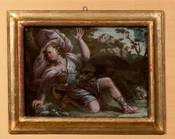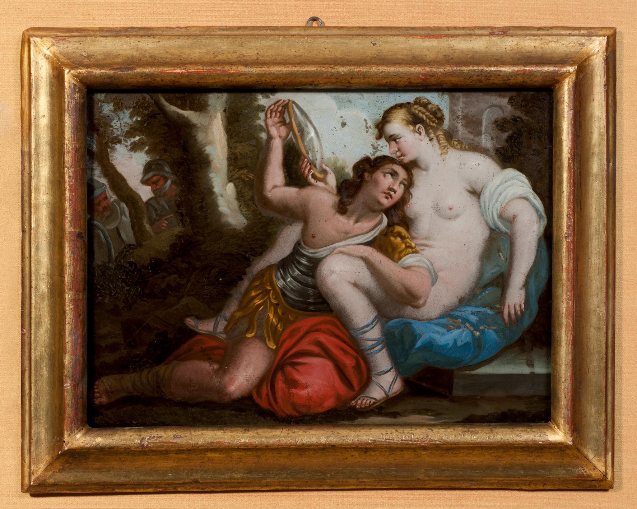 Die Szene gehört zu den öfters dargestellten Episoden des höfisch-heroischen, antik-christlichen Kreuzzugsepos "Gerusalemme liberata" (XVI, 17–25), das Torquato Tasso (Sorrent 1544–1595 Neapel) bis 1574 verfasste und in zahlreichen Editionen weitverbreitet war. Die eigentümliche Wiedergabe des Inkarnats, besonders gut erkennbar in den Schattenpartien Armidas und Rinaldos, sowie die virtuose Pinselführung lassen an Luca Giordanos (1634–1705) Handschrift denken. Seine vier formatähnlichen Hinterglasbilder aus Schloss Weissenstein bei Pommersfelden mit den Darstellungen von Venus und Mars (Inv.-Nr. 688, Seidel 1978. Taf. 113), Ariadne (Inv.-Nr. 689), Neptun (Inv.-Nr. 690) und Galathea (Inv.-Nr. 691) zeigen dieselben Eigenschaften der sicheren und schnellen Maltechnik. Ohne jede Radierung oder Metallhinterlegung auskommend unterscheidet sie sich dabei kaum von der gleichzeitigen Ölmalerei auf Leinwand in Neapel.