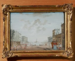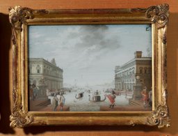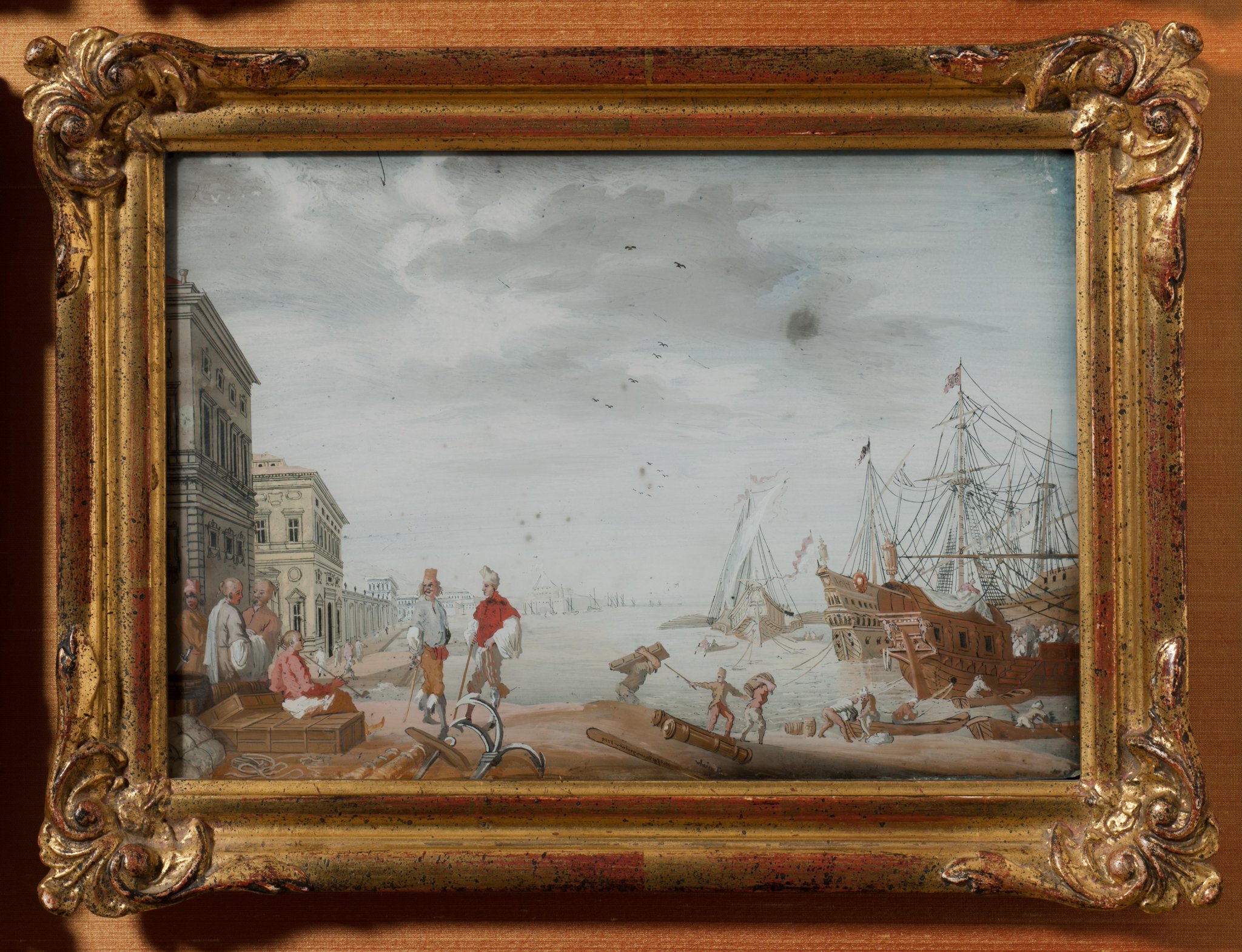 Die hintermalte Vedute, die sich ohne Ortsangabe präsentiert, zeigt unter weitem hellem Himmel einen Meereshafen mit ankernden Galeeren rechts, die von Seeleuten beladen werden. Im Vordergrund sitzt links ein pfeifenrauchender Asiate vor seinen Händlerkollegen auf Warenkisten. Neben Kanonenrohren, Ruder und Anker unterhalten sich zwei stehende Männer in modischer Tracht. Eine stark fluchtende Palastkulisse schliesst das Bild links ab.
