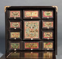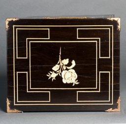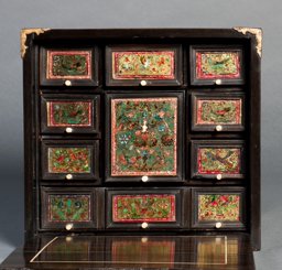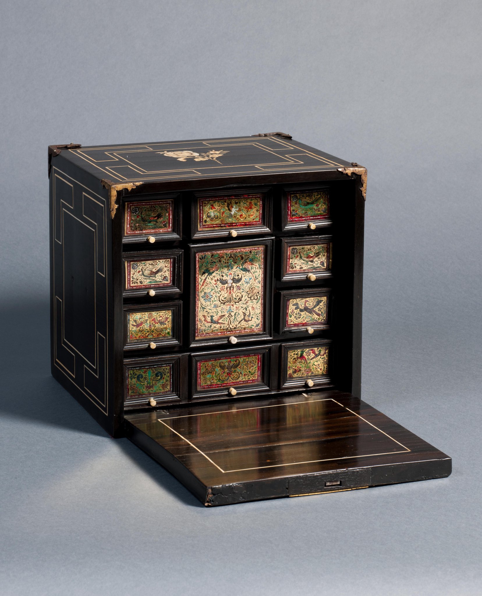 Das fast würfelförmige ebenholzfurnierte Kästchen mit feuervergoldeten Eckzierden aus Eisen und jüngerer, erdbeerrankenverzierter Schlossplatte zeigt auf der Schreibplatte und aussen geometrische Elfenbeineinlagen, die in der Mitte oben durch eine gravierte Rose, auf der Türfront mit einer Nelke bereichert werden. Es besass ursprünglich seitliche Tragegriffe. Bei geöffneter Klapptür – welche die Herkunft vom Typus des Schreibkastens belegt – werden elf symmetrisch angeordnete Schubkästchenfronten sichtbar, von denen die drei untersten die Front einer über die ganze Breite gehenden Schublade bilden. Die mit schmalen Profilleisten gerahmten Schauflächen sind mit amelierten Glastäfelchen belegt. Die Amelierungen zeigen inmitten von buntem Blätterwerk einen Dekor mit Fasanen und Harpyie in der Mitte, mit Vögeln, Grotesken, Blättern und Blumen.