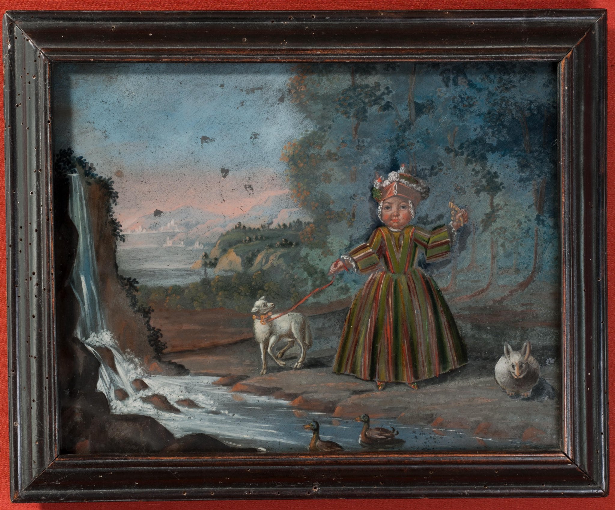 Am Ufer eines Baches, der von einem Wasserfall gespiesen wird und in dem zwei Enten schwimmen, steht ein kleines Kind in grün-rotem Seidenkleid mit blumengeschmückter Kopfhaube. Es hält in der Linken ein kleines Hifthorn und führt an der Rechten ein weisses Lamm an der Leine. Neben ihr kauert ein grosser Hase. Die rechte Bildhälfte beherrscht ein Wald, links öffnet sich bei Abendrot der Blick auf eine hügelige Seeuferlandschaft mit Ortschaften.