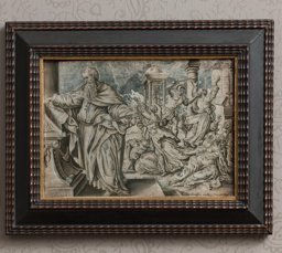 Neuer Rahmen. Die silberne, spiegelnde Metallfolie ist nicht aufgeklebt, sondern nur hinterlegt. Hinten befindet sich eine alte zusätzliche Hinterlage mit zweifacher Beschriftung "Johann Schaper" und "Schaper", darunter grobes Büttenpapier mit unidentifiziertem Wasserzeichen.