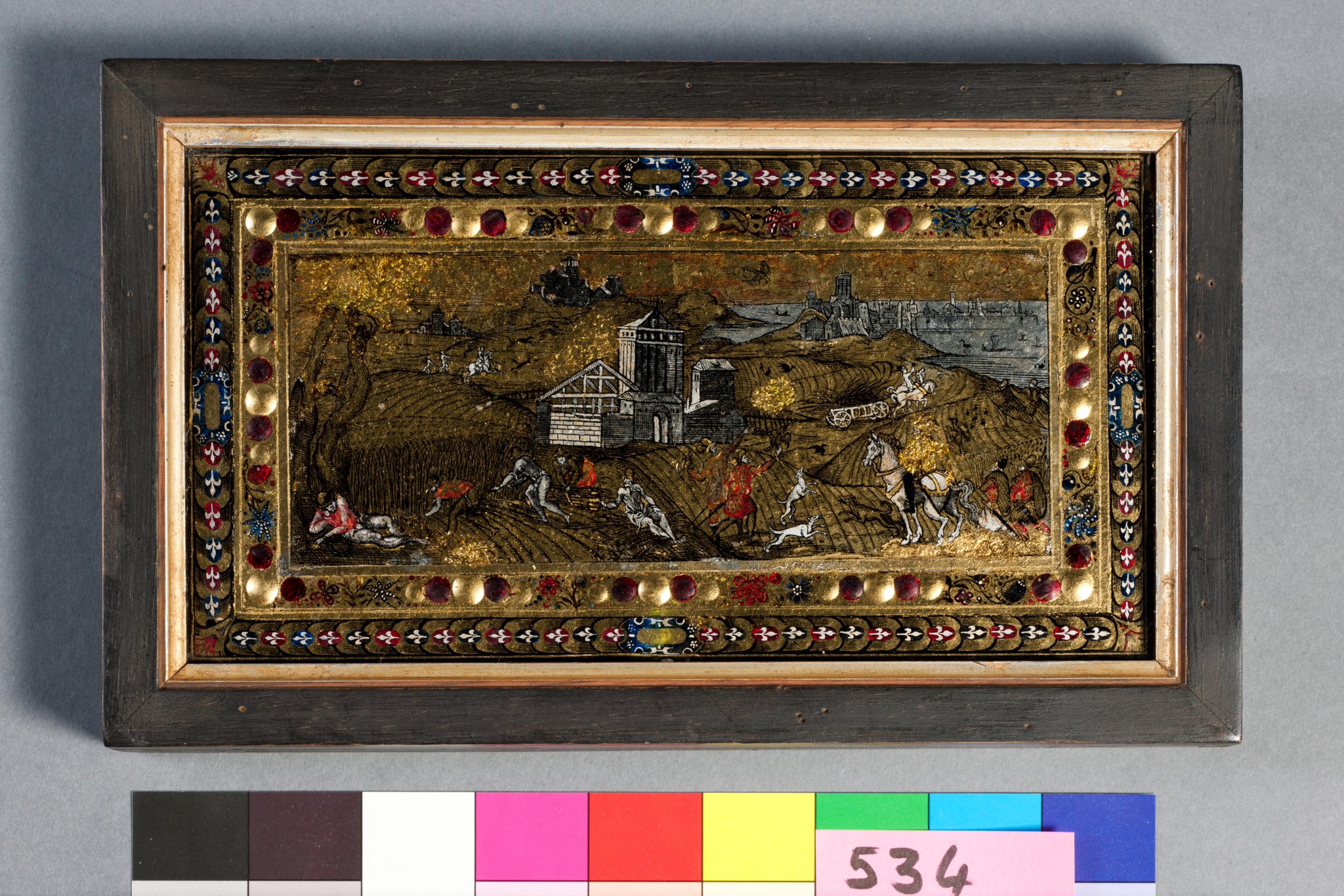 Das formatidentische Bildchen gehört der gleichen Serie von Monatsdarstellungen an wie sein Pendant PSV_446 (Inv.-Nr. RY 535). Auch hier sind zur Belebung des Goldgrundes einzelne Partien wie der berittene Falkner, das Laub der Bäume und Büsche sowie die Erdscholle unten rechts mit Muschelgold ausgeführt. In der Rahmenleiste ersetzt eine blaue Eglomisierung die ockergelbe Farbe des Pendants.