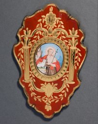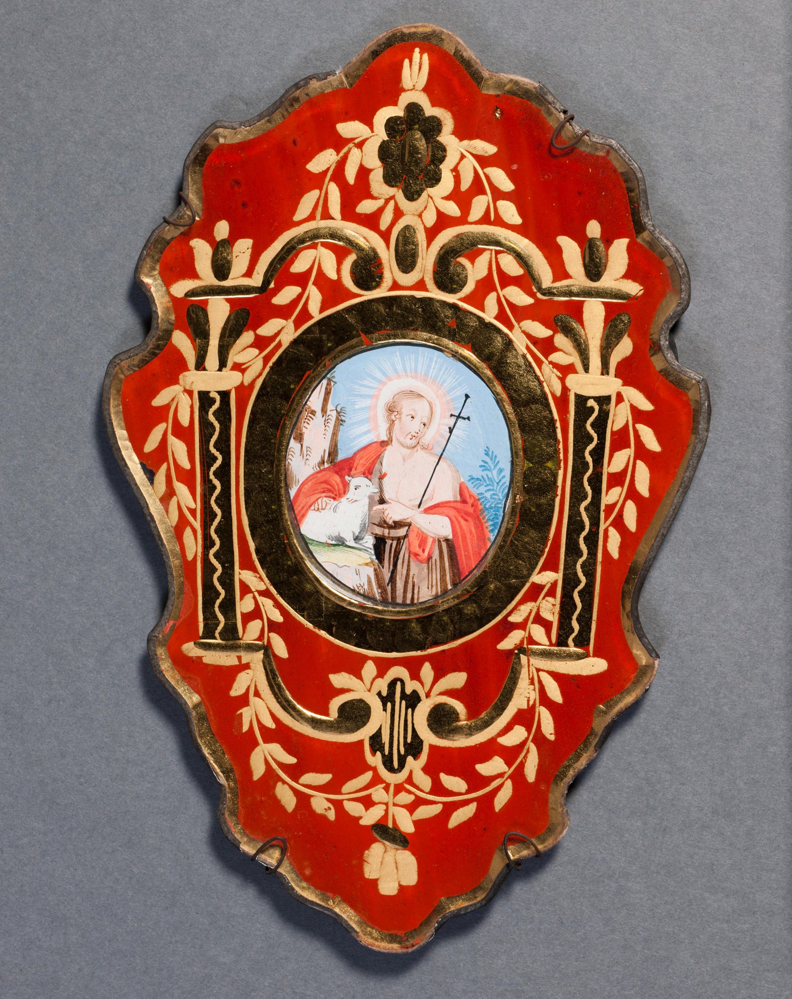 Die in Kartuschenform geschnittene Glastafel mit der feinen Bleifassung dient als Rahmen für ein ovales Papierbildchen in Gouache-Malerei. Dieses zeigt den nimbierten heiligen Johannes den Täufer mit Buch und Stabkreuz, der in felsiger Landschaft auf das Lamm als Sinnbild Christi weist. Die Glastafel bester Qualität ist mit Kugel-, Facetten- und Mattschliff reich verziert. Die in Rocaille- und Architekturformen geschliffenen Partien sind mit Blattgold hinterlegt, die ganze Tafel mit roter Farbe hintermalt.