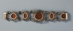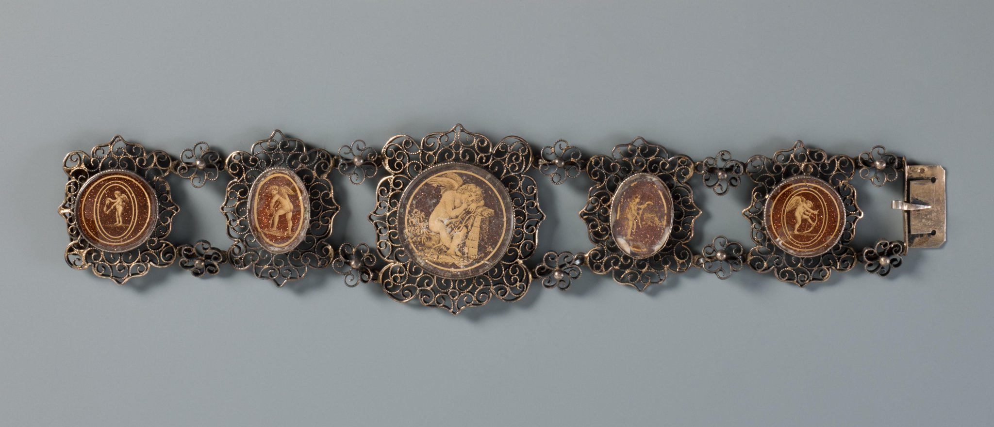 In feiner vergoldeter, ungepunzter Silberfiligranarbeit sind fünf Medaillons gefasst und mit kleineren Filigranrosetten zu einem Armband verbunden. Dass es sich dabei um Hinterglas-Goldradierungen handelt und nicht um Radierungen auf Hämatit beweisen abgefallene Goldsplitterchen, die zwischen der Goldradierung und dem Hämatit liegen. Die Medaillons sind der Liebe gewidmet: das zentrale, runde, grössere zeigt den sinnenden Liebesgott Amor, der über seinen Köcher und Bogen an eine Stele gelehnt im Rosenbeet sitzt. Die flankierenden hochovalen Plättchen stellen links das nackte Amorkind dar, das seinen Bogen schnitzt, rechts einen Putto, der ein Weihgeschenk hält. Die abschliessenden runden Medaillons aussen tragen in hochoval umrandeten Feldern links das Bild eines Puttos mit einer Girlande, rechts eines bogenspannenden Amors. Die ovalen und die runden äusseren Medaillons sind mugelig geschliffen.