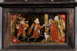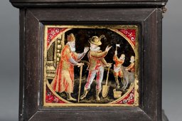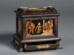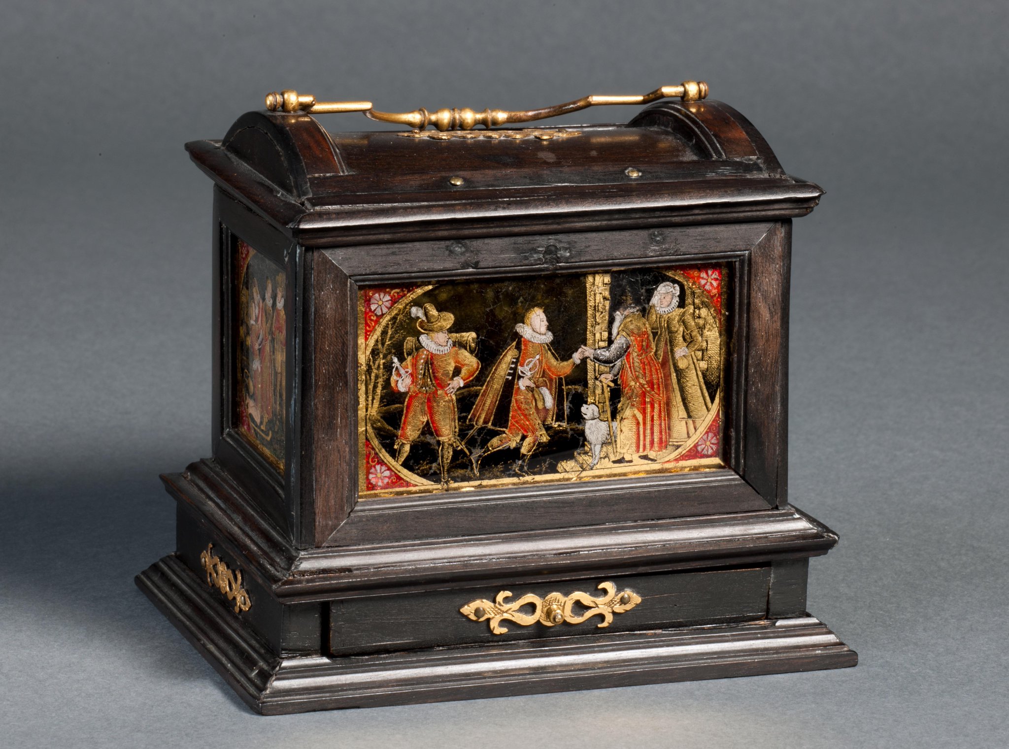 Das schwarze, mit grüner Seide ausgeschlagene Kästchen aus Fruchtholz mit gewölbtem Deckel besitzt oben einen Bügeltragegriff. Die Sockelzone mit Messing-Beschlägen birgt eine Schublade. In die vier Seiten des Kästchens sind kleine Hinterglastafeln eingesetzt, die in Querovalen mit rot amelierten Zwickeln das Gleichnis vom verlorenen Sohn erzählen (Lk 15,11-32). An der Schmalseite beginnend ist dargestellt, wie der jüngere Sohn, die Feldarbeit verachtend, vom greisen Vater seinen Erbanteil fordert, während im Hintergrund geschlachtet wird. Auf der breiten Frontseite des Kästchens nimmt der reich gekleidete Sohn von der weinenden Mutter, von Vater und Hund an der Hauspforte Abschied, während ihn sein reisefertiger Freund bereits erwartet. Die zweite Breitseite schildert die späte Reue des völlig verarmten und zerlumpten Sohnes, der von Borstenschweinen umgeben beim Bauernhof auf die Knie gesunken ist. Das letzte Bild auf der Schmalseite zeigt nach der Rückkehr zum väterlichen Hof die gnädige Aufnahme durch Vater, Mutter, Magd und Bruder, der ihm das beste Kleid bringt. Die gewölbte, wohl mit einer Szene des prassenden Sohnes versehene Hinterglasmalerei des Deckels ist verloren und durch einen Messing-Zierbeschlag ersetzt.