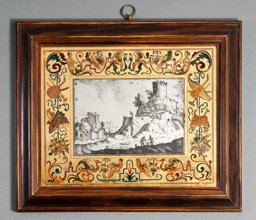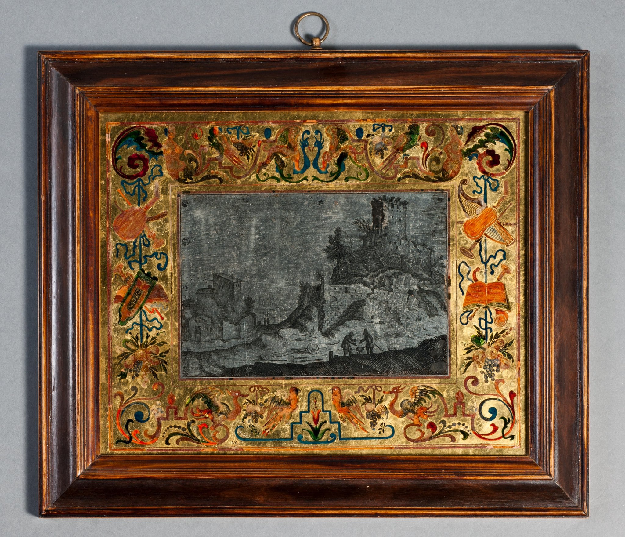 Zwei stehende Hirten mit einem Schaf heben sich im dunklen Vordergrund von einer in helles Licht getauchten Burgruine auf felsiger Anhöhe ab. Links ist ein ummauerter Gutsbetrieb zu sehen, im Hintergrund eine Ansiedlung, vor der zwei weitere Personen stehen. Die in Silber radierte, schwarze Zeichnung umgibt ein golden amelierter Rahmen, dessen Bandelwerk in fast spiegelbildlicher Symmetrie Grotesken, Papageien, Fruchtgirlanden, Schnecken, Blumen, Musikinstrumente und Notenbücher zieren.