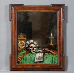 Vor dem Spiegelgrund erscheint in der unteren Bildhälfte ein memento mori als Allegorie der Vanitas. Auf einem grünen Tischtuch mit Goldborte ruht ein rosenbekränzter Totenschädel neben einem geschlossenen und einem aufgeschlagenen Notenbuch. Auf diesen liegt eine Geige mit ihrem Bogen. Im Hintergrund mahnen rechts eine eben ausgeblasene Kerze und links eine zeigerlose Tischuhr mit römischen Stundenziffern und mit der Aufschrift VNA / EX HIS an die Vergänglichkeit menschlichen Lebens und Tuns.