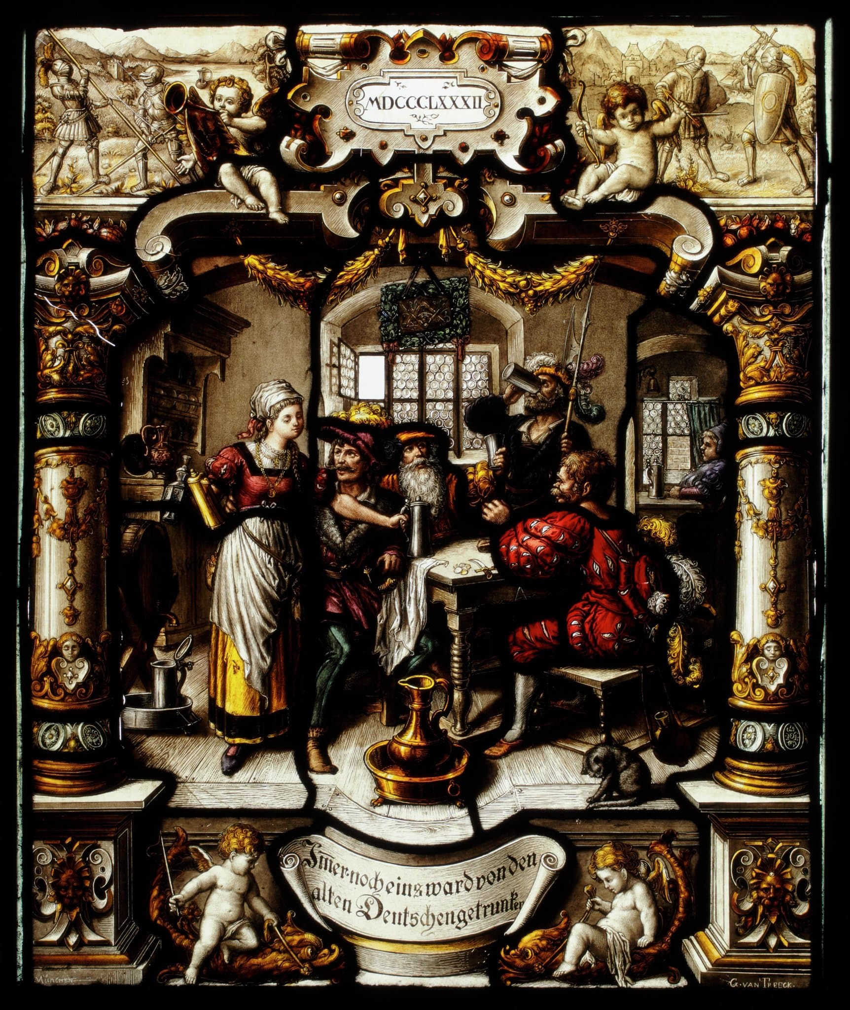 Dans le registre inférieur, deux petits anges chevauchant un monstre marin entourent un phylactère portant l’inscription: “Imer noch eins ward von den alten Deuschen getrunken”. Sur les bases des colonnes se trouvent à gauche l’inscription “MÜNCHEN”, à droite “G. VAN TREECK.”