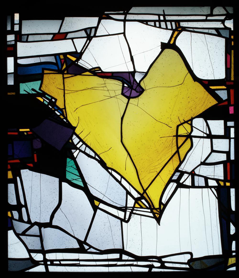 La feuille de lierre est clairement reconnaissable dans ce panneau figuratif, alors que la majorité des vitraux de Georg Meistermann, dès les années 1950, se distinguent par une complète abstraction. Dès 1975 environ, les motifs figuratifs reprennent toutefois un peu plus d’importance dans son œuvre. Le motif de la feuille apparaît dès 1973 dans les peintures de l’artiste (cf. Gausling, 1981, Katalog Nr. 127) et se rencontre dans ses œuvres graphiques jusqu’à la fin de sa vie. Une huile sur toile de 1982 intitulée “Herbstliches Blatt” s’approche le plus du sujet de notre vitrail (Grimme, 1984, N°cat. 46, p. 36). Certains traits tracés à la grisaille sur les verres jaunes pourraient évoquer les nervures de la feuille de lierre. Toutefois, leur présence sur d’autres verres semble plutôt indiquer que l’artiste souhaitait par ces traits animer la surface du verre, jusqu’à évoquer des fausses fissures et des structures sur le verre. L’utilisation de la grisaille pour élargir les baguettes de plomb et souligner leur présence et fonction graphique est à relever. L’artiste a accordé un grand soin au choix des verres, combinant des verres antiques et des verres opaques et jouant avec leurs divers degrés de translucidité et d’opacité. Dans un interview accordé en 1979 à Manfred de la Motte, Georg Meistermann déclare à ce sujet: “Wenn ich ein Bild male, oder wenn ich aquarelliere, dann kann ich eine bestimmte Transparenz, eine Durchsichtigkeit erreichen, oder ich kann pastos malen, also dicht werden. Beim Glas hingegen stellen sich diese Probleme nur einmal und zu Anfang: wie dicht darf ein Glas sein, wie durchsichtig darf es sein – oder wie wenig durchsichtig muss es sein. [ ] Einige Opalgläser lasse ich dicht herstellen, dass sie wie transparentes Porzellan wirken.” (De la Motte, 1979, p. 17; traduction partielle de cette citation dans Trümpler, 1990, p. 6). Le style très graphique, ainsi que l’important contraste entre les verres clairs et foncés sont récurrents dans l’œuvre verrière de l’artiste.