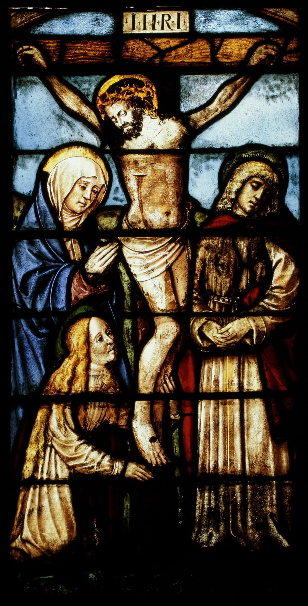 Cette scène de la Crucifixion provient probablement de France. De grandes similitudes stylistiques et iconographiques avec la crucifixion sur le vitrail des saints Crépin et Crépinien dans une chapelle septentrionale de l’église Notre-Dame à Bourg-en-Bresse (1530-1539) ont été relevées (Kurmann-Schwarz, 2006). Les ressemblances sont frappantes notamment dans les visages de la Vierge et de saint Jean, ainsi que dans la partie supérieure du Christ (voir Chaussée, 1986, p. 246, fig. 216). Les vitraux de Bourg-en-Bresse sont attribués à l’atelier de l’un des deux verriers locaux, Jean Brachon ou Jean Orquois. Ces derniers ont réalisé avec le verrier lyonnais Antoine Noisin les vitraux de l’église Saint-Nicolas-de-Tolentin de Brou, également situé à Bourg-en Bresse, d’après des cartons d’un peintre bruxellois anonyme (Chaussé, 1986, p. 250). Les jambes du crucifié tournées vers la droite sont caractéristiques dans l’art de la fin du XVe siècle, comme on le trouve par exemple dans la crucifixion de la série de xylographies de Dürer intitulée “Petite Passion” (1509) (Kurmann-Schwarz, 2006).