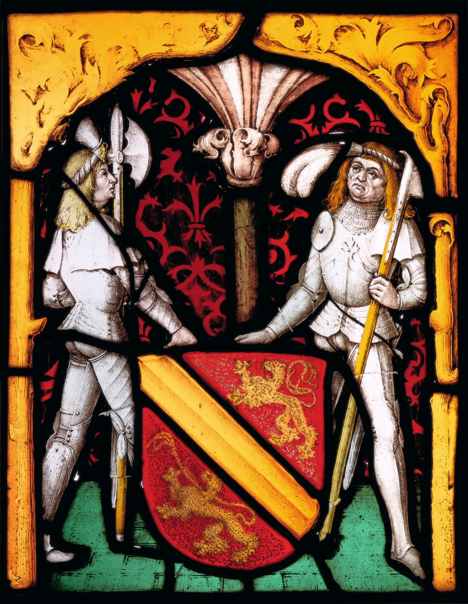 Die Grafschaft Kyburg war im 15. Jahrhundert an Zürich gelangt, das ihren Vogteisitz in der Kyburg bei Winterthur einrichtete. Um 1500 muss der damalige Landvogt das vorliegende Glasgemälde in Auftrag gegeben haben, das stilistisch in das Werk des Zürcher Glasmalers Lukas Zeiner (um 1454–vor 1513) einzuordnen ist. Dies macht ein Vergleich mit den Standesscheiben für den Tagsatzungssaal in Baden AG deutlich, die Zeiner Anfang des 16. Jahrhunderts schuf. Am nächsten steht ihm sicher die Schwyzer Standesscheibe im Schweizerischen Nationalmuseum Zürich. Sie weist in der Haltung der Schildbegleiter, der Behandlung der Rüstung und im Gesichtsschnitt des linken Kriegers auffallende Parallelen auf (Inv.-Nr. IN 2/2. Schneider 1954. Abb. 7; Schneider 1971. Bd. I. S. 44, Nr. 67; Bergmann 2014. Bd. 2. Abb. 295.1). Eine zweite Scheibe der Vogtei Kyburg, die ebenfalls als Werk Lukas Zeiners betrachtet wird, stellt dem Wappen ein Wildleutepaar zur Seite. Die möglicherweise aus der Pfarrkirche Pfäffikon stammende, um 1490 entstandene Scheibe wird heute im Victoria and Albert Museum in London aufbewahrt (Inv.-Nr. C. 9:1-1923. Boesch 1954. S. 78; Bergmann 2014. Bd. 2. Abb. 295.2).