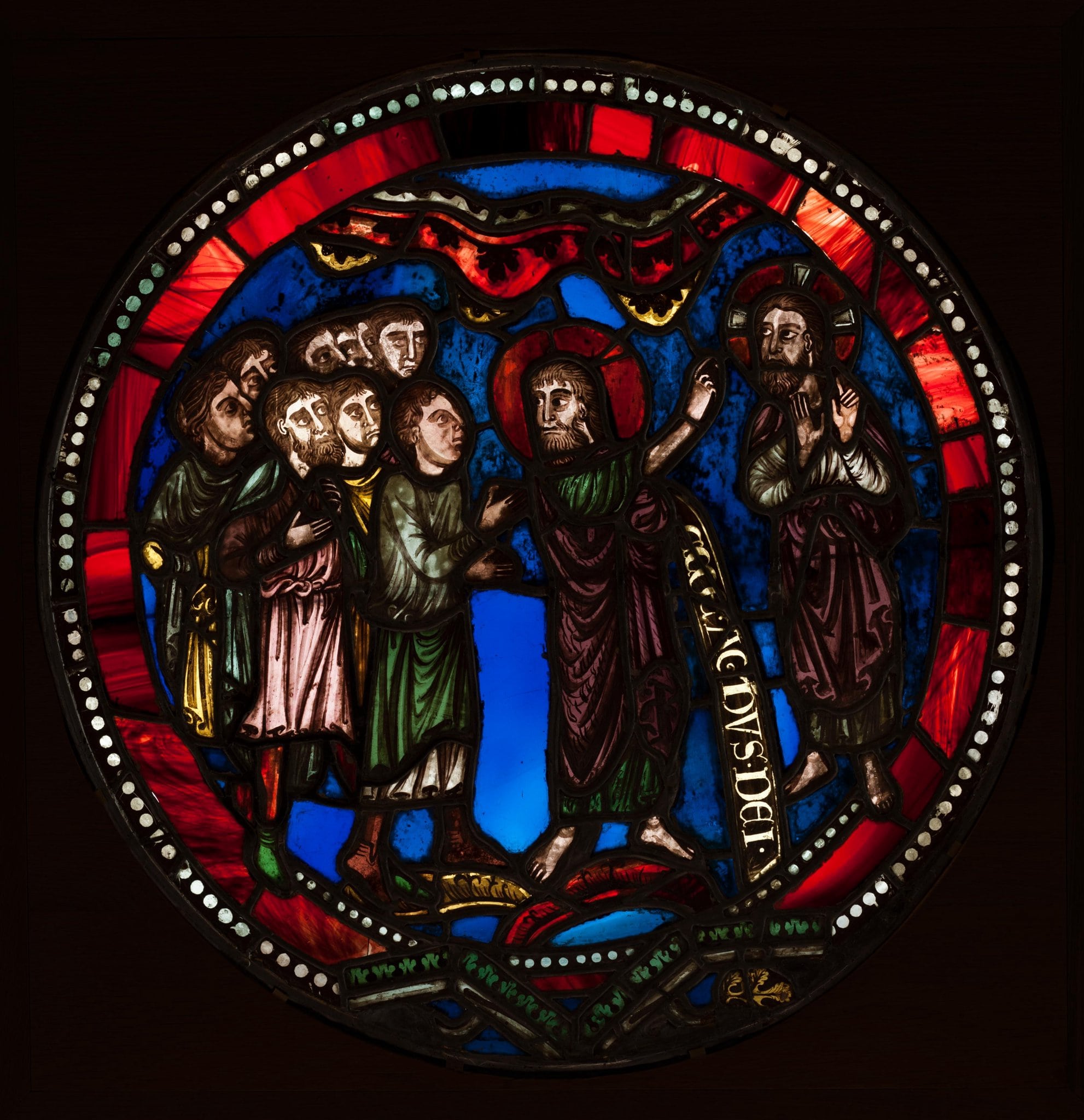 Médaillon médiéval représentant sur fond bleu Jean-Baptiste présentant Jésus à la foule. Au centre se trouve Jean-Baptiste, auréolé de rouge et vêtu d’une tunique verte et d’un manteau violet. Son visage se tourne vers les huit personnages qui assistent à la scène, à sa droite. Son bras droit désigne le Christ qui apparaît sur la droite. Ce dernier est vêtu d’une tunique blanche et d’un manteau violet. Son regard est dirigé vers le haut. Il est auréolé de rouge, avec trois rayons blancs. Ses bras sont repliés sur sa poitrine. Un phylactère placé entre le prédicateur et le Christ porte l’inscription ECCE AGNUS DEI. Au-dessus des personnages, le ciel est symbolisé par des lignes ondoyantes blanches, rouges et jaunes. La foule est debout sur un arc jaune, Jean-Baptiste sur un arc rouge. Le médaillon est encadré d’un filet d’encadrement rouge et d’un fin filet d’encadrement perlé. Sur le bas, les filets d’encadrement sont interrompus par une frise verte à palmettes dessinant un segment d’étoile.