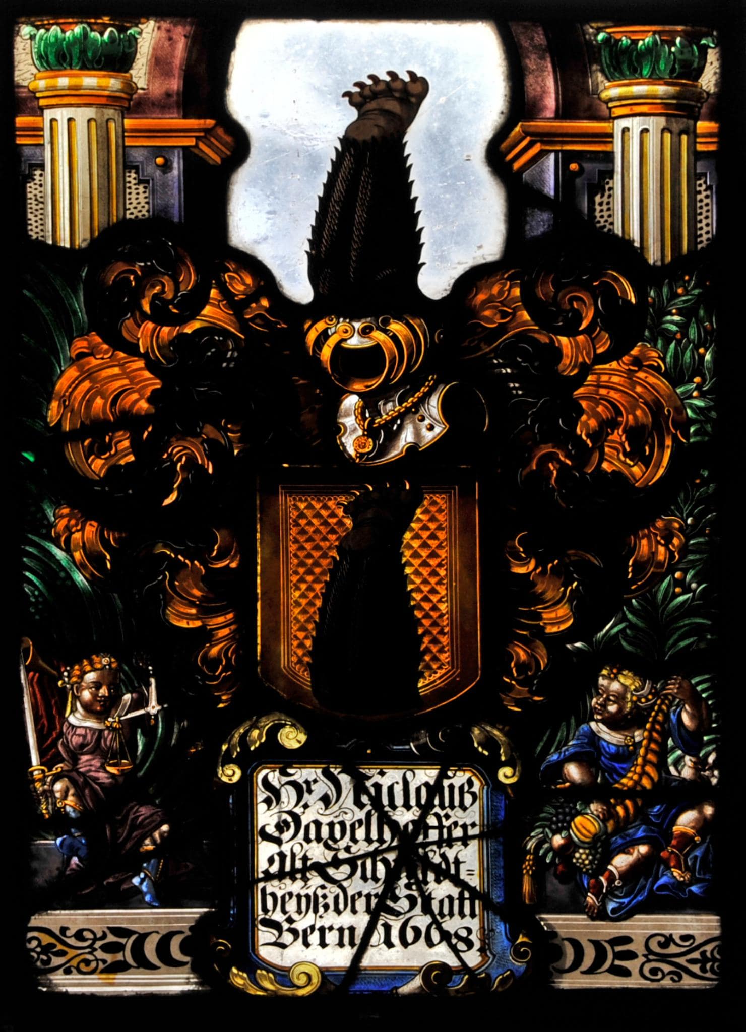 Das Vollwappen Niklaus Dachselhofers fusst auf der Rollwerkkartusche mit der Stifterinschrift. Diese Kartusche begleiten zwei sitzende allegorische Figuren. Diejenige links mit Richtschwert und Waage ist die Justitia und diejenige rechts mit dem Überfluss und Wohlstand symbolisierenden Füllhorn die Ceres. Hinter dem Wappenschild erhebt sich vor farblosem Grund eine Pfeilerarkade mit vorgelagerten kannelierten Säulen.