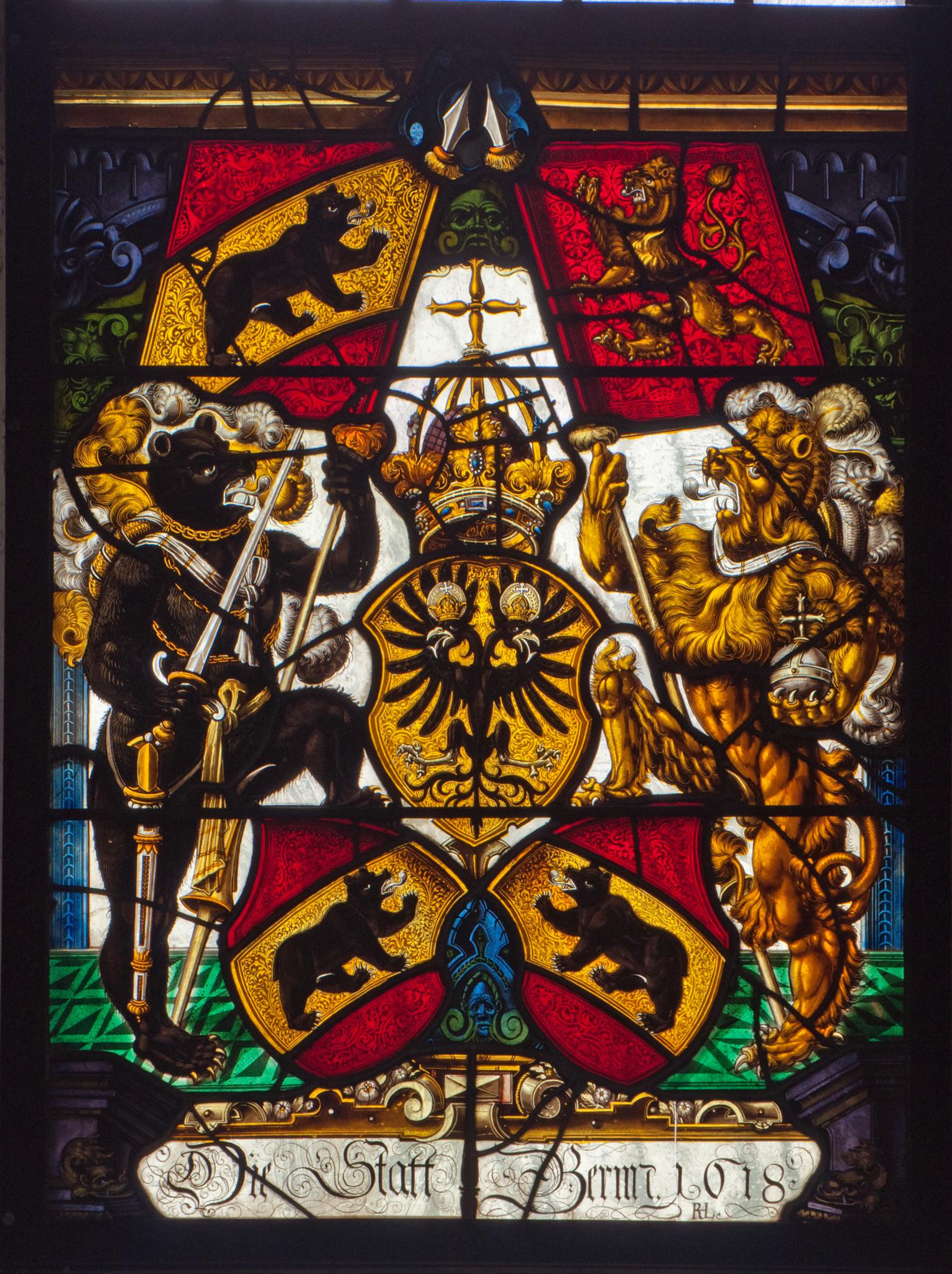 Vor farblosem Grund ruht die bekrönte Wappenpyramide Bern-Reich in Begleitung des Berner Bären und Zähringer Löwen. Diese haben ihre Hinterpranken auf den grün gefliesten Boden bzw. einen der Bernschilde gestellt und halten ihre Banner empor. Von den beiden vor einem Flachbogen postierten, mit prächtigen Federhüten ausgestatteten Schildwächtern hält der Berner Bär das Reichsschwert und der Zähringer Löwe den Reichsapfel in der Vorderpranke. Am Scheibenfuss steht in einer gelben Rollwerkkartusche die von violetten Konsolen flankierte Stifterinschrift.