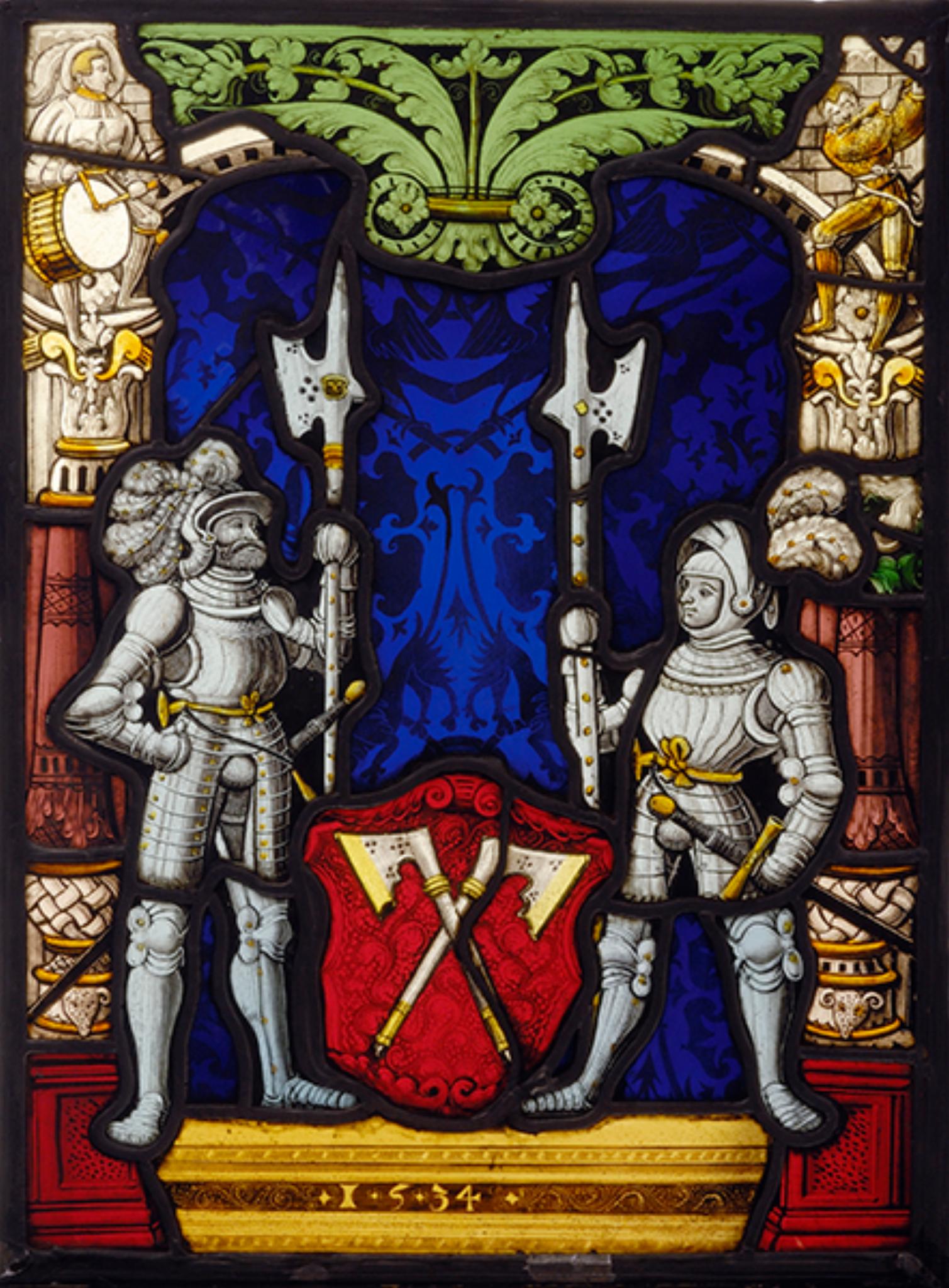 Zwei alte Flickstücke in der Mitte des rechten Randes hinter dem Helmbusch; Sprungbleie; die Verbleiung erneuert.