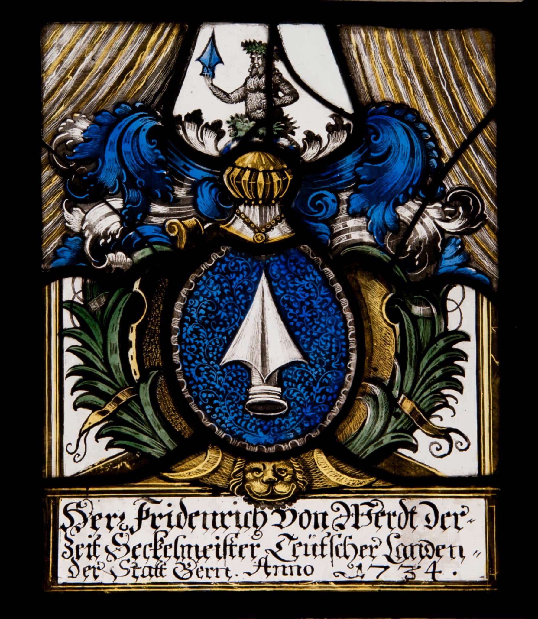Vor farblosem Grund und einem grauen, zurückgezogenen Vorhang prangt das Vollwappen des Friedrich von Werdt in einer ovalen, von Palmwedeln umkränzten und mit einer Löwenkopfmaske geschmückten Kartusche. Am Fuss schliesst ein Sockel auf ganzer Scheibenbreite die Stifterinschrift ein.