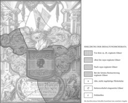 Der Wappenschild, Stücke der Helmdecke, das Glasstück mit der Patientia unten rechts und der anschliessende Teil der Inschrift neu ergänzt; zahlreiche Sprungbleie; die Verbleiung erneuert.