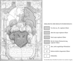 Der Wappenschild, ein Stück der Helmdecke und das Glas rechts neben der Helmzier neu ergänzt; der rechte Teil der Schriftkartusche mehrfach zerbrochen; Sprungbleie; die Verbleiung erneuert.