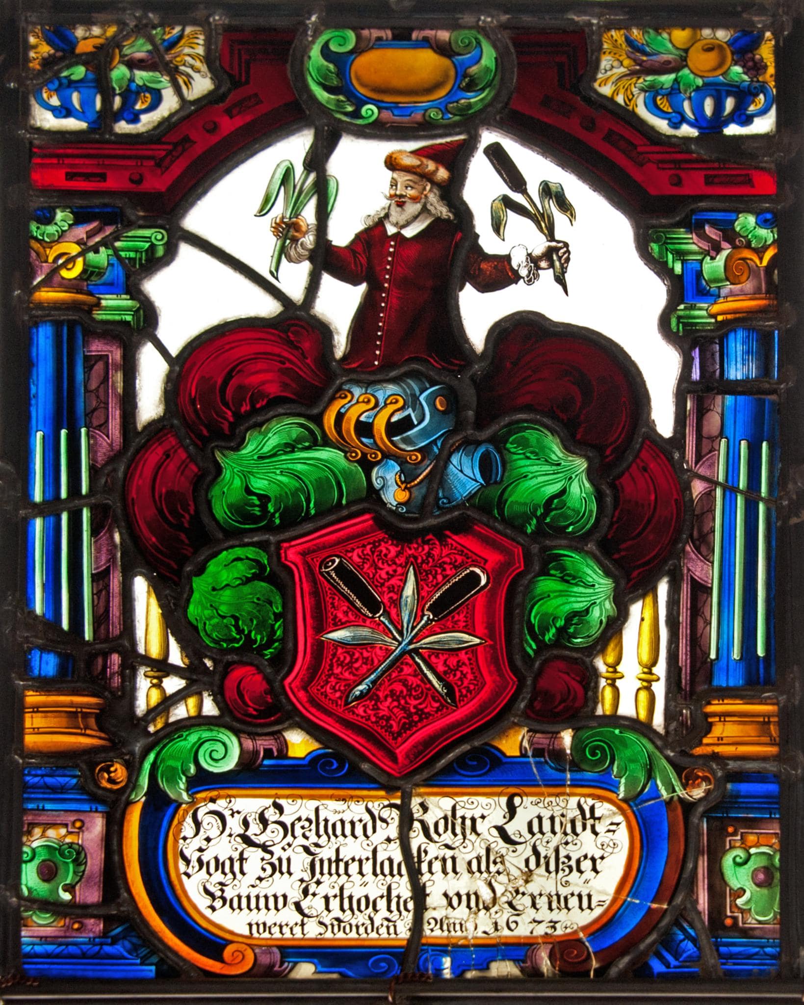 Hr. Gerhard Rohr Landt= / Vogt Zů Jnterlacken als diβer / Bauw Erhöchet vnd Erneu= / weret worden Ain 1673.