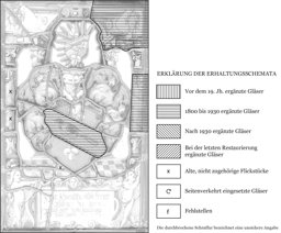 Das Glas in der Ecke oben rechts, die Säule rechts und der Balken im Wappen neu ergänzt; in der linken Säule zwei alte Flickstücke und ein weiteres solches Flickstück im Fliesenboden; Sprungbleie; die Verbleiung erneuert.