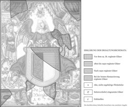 Vor farblosem Grund hält ein Engel in langem rotem Gewand das auf die Schriftkartusche gesetzte Stadtwappen von Burgdorf. Diesen begleiten zwei allegorische Frauengestalten, die auf dem Podium vor den Rahmenpfeilern stehen. Diejenige links in blauem Rock, rotem Brustpanzer und mit blauem Helm kann anhand ihrer Attribute Lanze und Schild als Victoria identifiziert werden. Ihr Gegenüber, eine barbusige lorbeergekränzte Frau in weissem Gewand, stellt aufgrund des Schildes mit der ausgestreckten Hand und anhand der Früchte zu ihren Füssen die Allegorie der Pax dar.