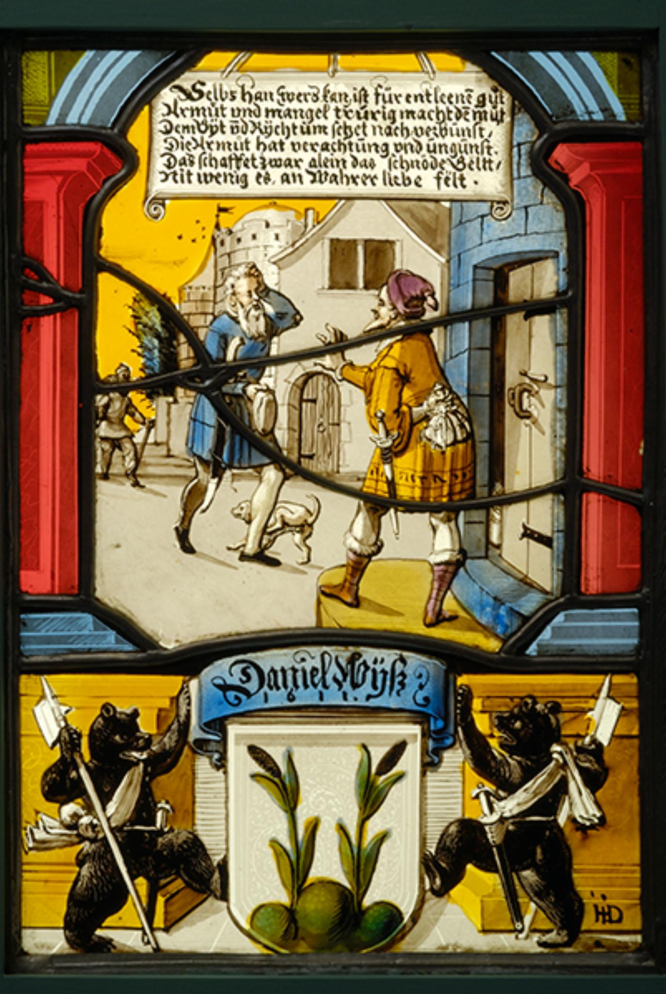 Das Zentrum der Scheibe nimmt die allegorische Darstellung des Geizes ein. Auf einem Stadtplatz steht vor seiner Haustür ein älterer Mann. Der Geizkragen weist mit ausgestreckter Hand einen um Almosen bittenden Mann ab, während er seinen Geldbeutel in der Hand hinter seinem Rücken verbirgt und ein Hund den Bittenden anpinkelt. Die Szene rahmt eine Arkade aus roten Pfeilern und einem hellblauen Bogen. In der Fusszone sind vor mächtigen gelben Postamenten zwei Bären mit Halbarten postiert. Sie halten über dem Wappen des Daniel Wyss das Schriftband mit dem Stifternamen und Datum empor.