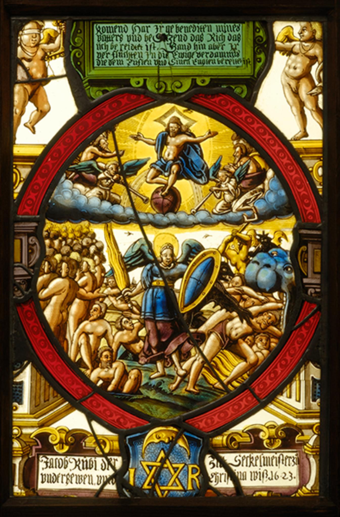 Die Scheibe zeigt in ovaler roter Einfassung das Jüngste Gericht mit dem Erzengel Michael, der mit feurigem Schwert und Schild in seinen Händen den Seligen und den Verdammten nach ihrer Auferstehung den Weg in den Himmel bzw. den Höllenrachen weist. Über das Geschehen wacht der Weltenrichter Christus. Über blauem Wolkenkranz von zwei musizierenden Engeln begleitet, erscheint er in goldener Gloriole auf der Weltkugel thronend. Hinter dem ovalen Hauptbild erhebt sich, kaum sichtbar, eine konkav gebildete Rahmenarchitektur. Auf dieser stehen oben zwei Putten mit den Attributen der Gerechtigkeit (Waage, Augenbinde) bzw. der Weisheit (Schlange) in ihren Händen. Sie halten die grosse grüne Rollwerktafel mit der Bildlegende. Den Scheibenfuss füllt die Schriftkartusche mit dem zentral aufgesetzten Wappen von Jakob Rubi.