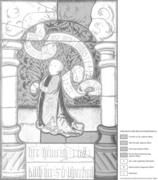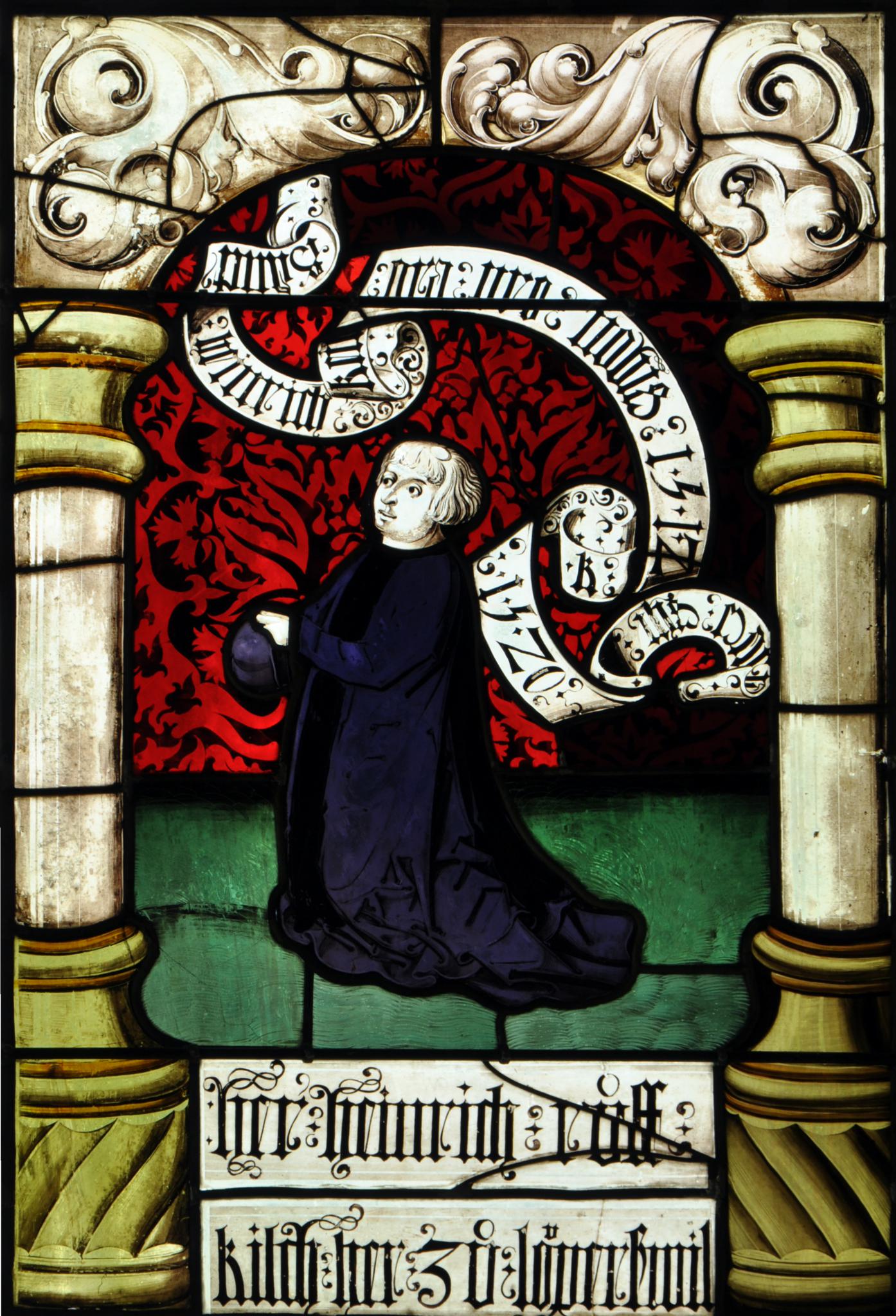 Von den vier zu Paaren übereinander angeordneten Glasgemälden Heinrich Ruffs bildet dasjenige mit der Stifterfigur das rechte untere Stück.