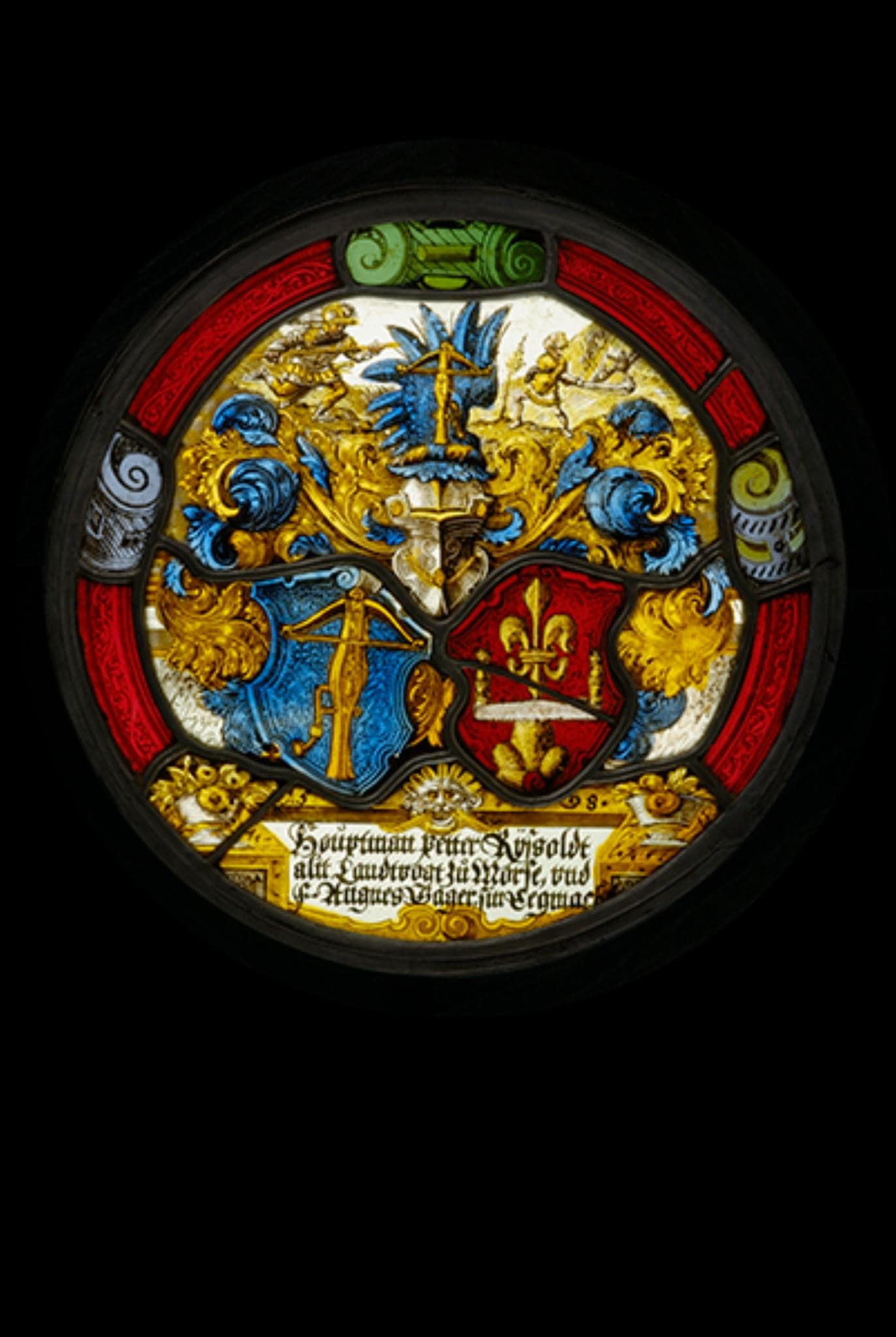 Vor farblosem Grund sind die Vollwappen von Peter Risold und Agnes Sager auf das beschriftete Podium mit Masken- und Blumenschmuck gesetzt. Über ihren Helmdecken ist Davids Kampf gegen Goliath festgehalten. Die Wappenschilde umfasst eine rote, von drei Rollwerkstücken unterbrochene Bordüre.