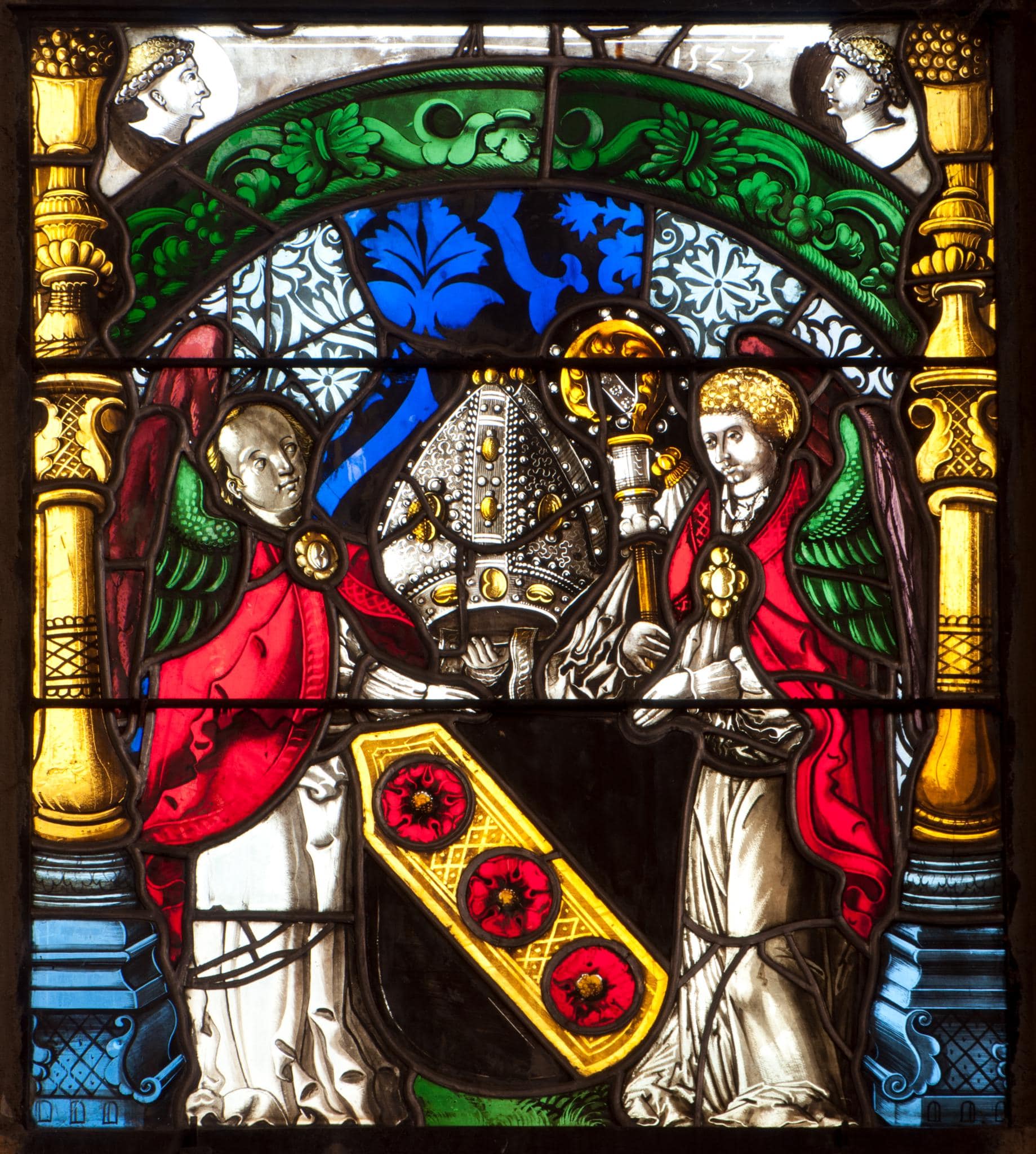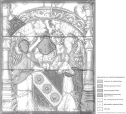 Der linke Engelskopf alt ergänzt; das Mittelstück am oberen Rand neu ergänzt; stellenweise Verluste in der Bemalung; mehrere Sprungbleie; die Verbleiung erneuert.