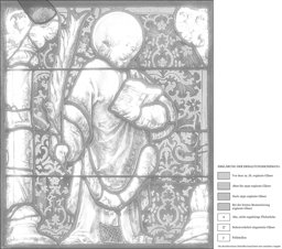 Ein Glas (Blattstück) am Rand oben links neu ergänzt; stellenweise erhebliche Verluste in der Bemalung; mehrere Sprungbleie; die Verbleiung erneuert.