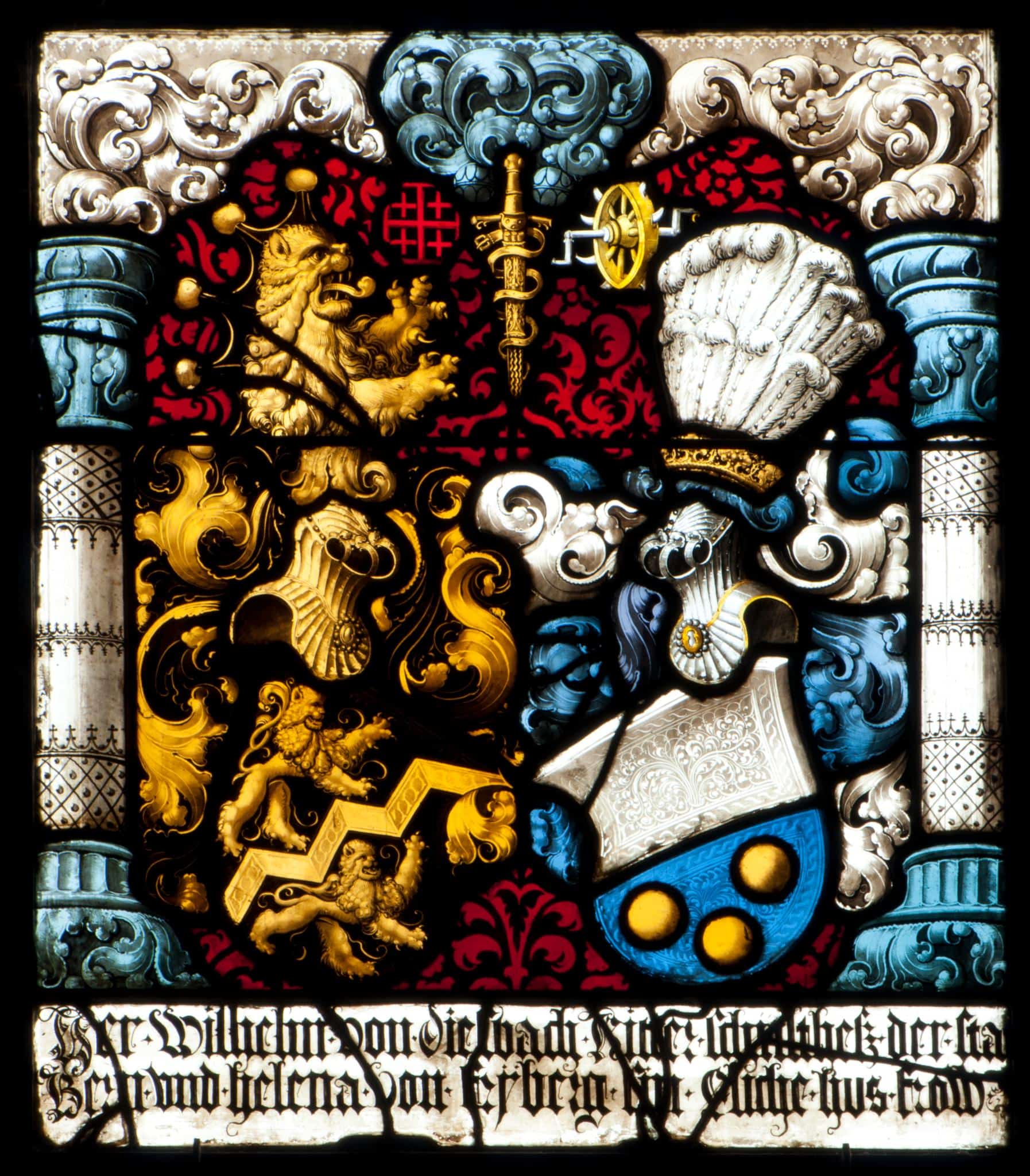 Die Allianzscheibe zeigt nicht das Wappen der letzten Ehefrau Wilhelms I., Anastasia Schwend (Heirat 1501), sondern von dessen zweiter Ehefrau, Helena von Freiberg (Heirat 1479/80). Der Grund dafür liegt wahrscheinlich darin, dass diese zweite Ehe zu zahlreichen Nachkommen führte, während die anderen beiden Ehen kinderlos blieben.