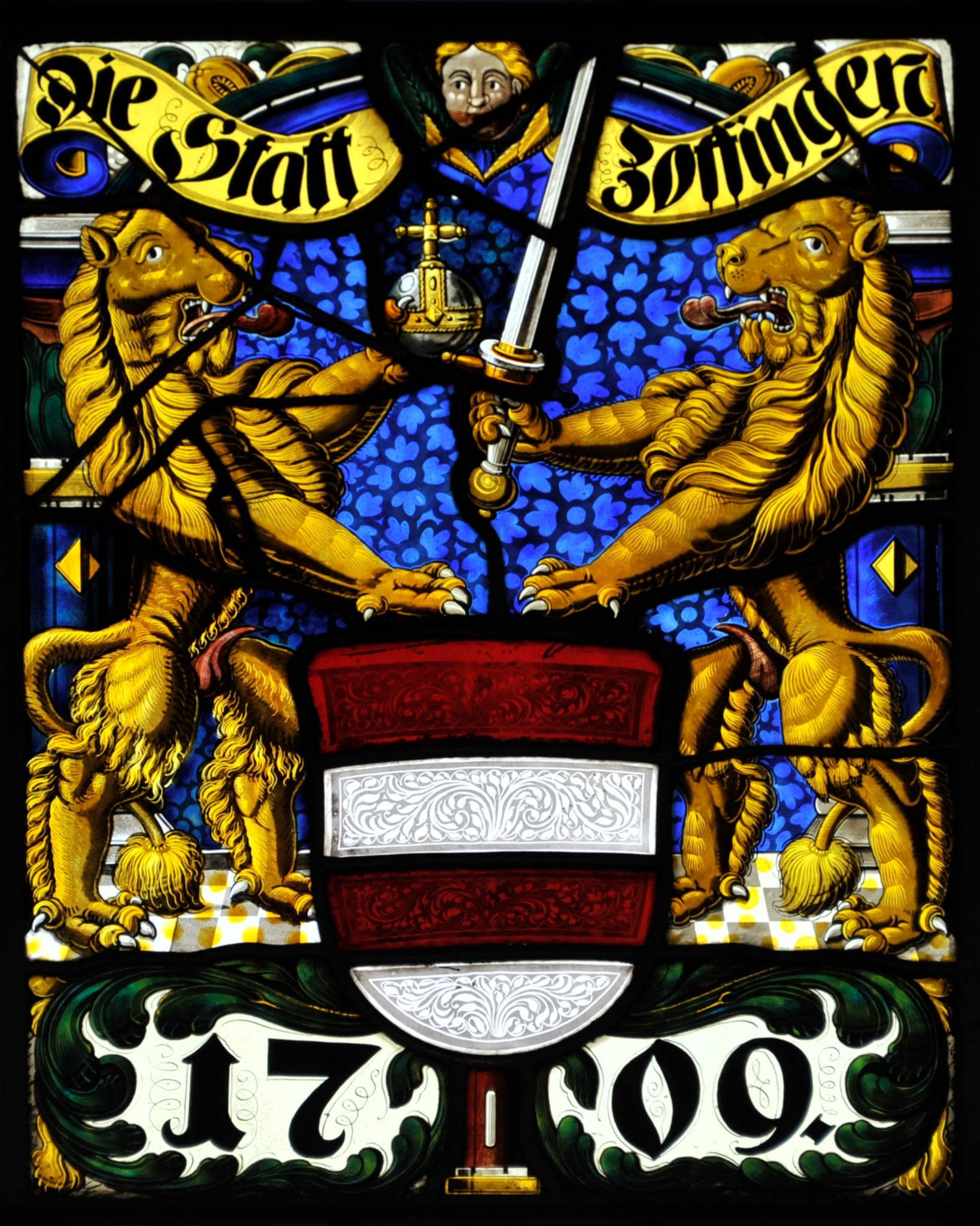 Das Stadtwappen Zofingens ist vor blauem Damastgrund dargestellt. Es wird von zwei den Reichsapfel bzw. das Richtschwert in ihren Vorderpranken haltenden Löwen präsentiert. Die beiden Schildwächter stehen auf dem gefliesten Boden des Podiums, an dessen Front das von einer grünen Blattranke umkränzte Stiftungsjahr prangt. Hinter Wappen und Löwen erhebt sich eine Rahmenarchitektur aus blauen Pfeilern und einem blauen Flachbogen. Vom Engelskopf am Bogenscheitel ausgehend, zieht sich vor dem Bogen ein gelbes Schriftband mit dem Namen Zofingens hin.