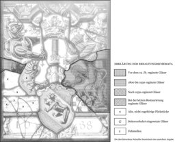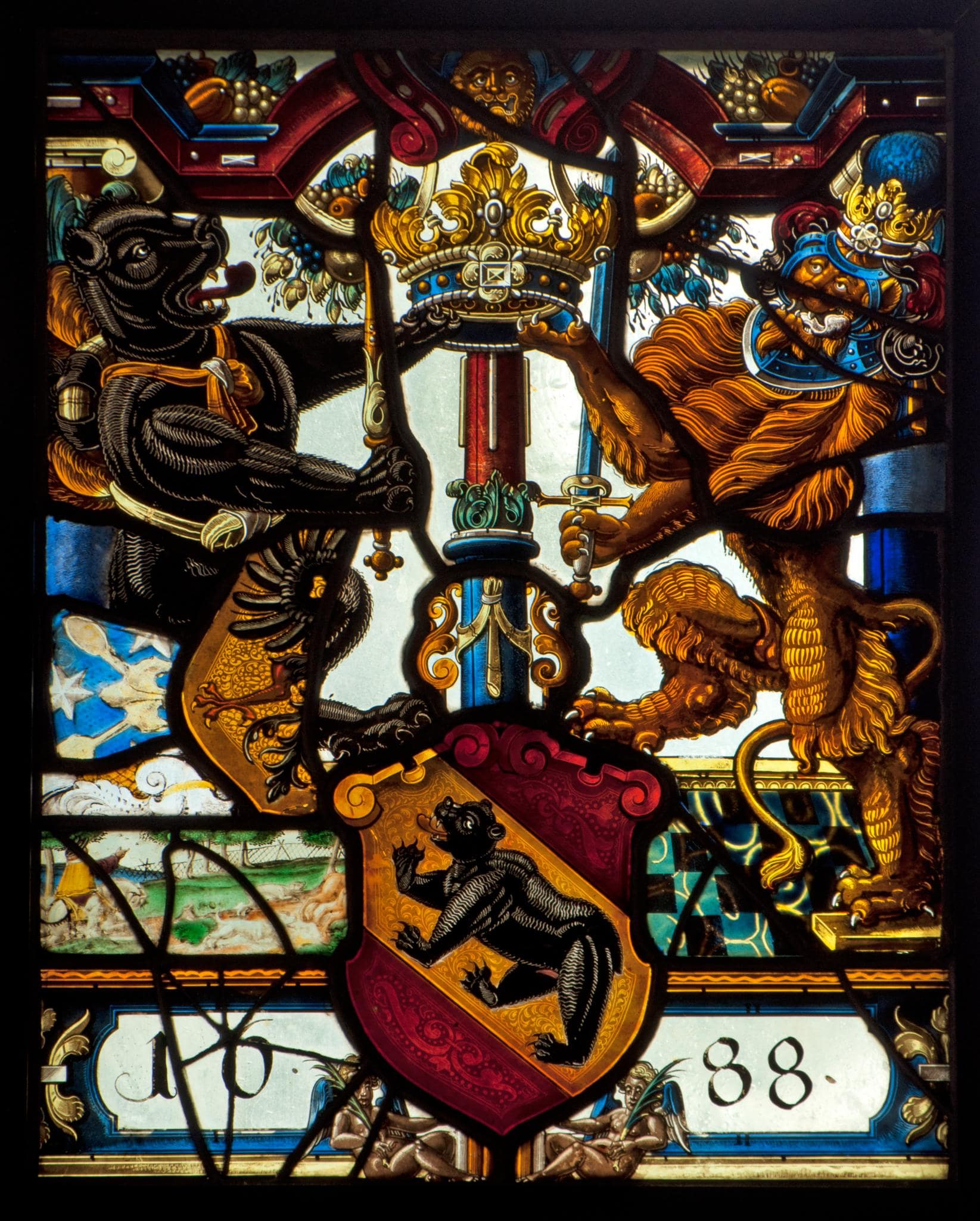 Der einzelne Bernschild wird von zwei kleinen am Scheibenfuss vor dem Podium sitzenden Putten gehalten. Neben ihm sind der Berner Bär und der Zähringer Löwe auf dem Fliesenboden postiert. Während der Bär ein Federbarett um den Hals gebunden hat, trägt sein Begleiter den Helm mit der Zähringer Krone. In ihren Vorderpranken halten die beiden vor farblosem Grund stehenden Schildwächter Zepter und Richtschwert sowie gemeinsam über dem Wappen eine Adelskrone empor. Zwischen ihnen erhebt sich eine isoliert in die Höhe ragende Säule. Die Rahmenarchitektur besteht aus blauen Rundpfeilern und einem eingezogenen roten Flachbogen, an dessen Scheitel eine Löwenmaske prangt und an dem Fruchtbouquets aufgehängt sind.