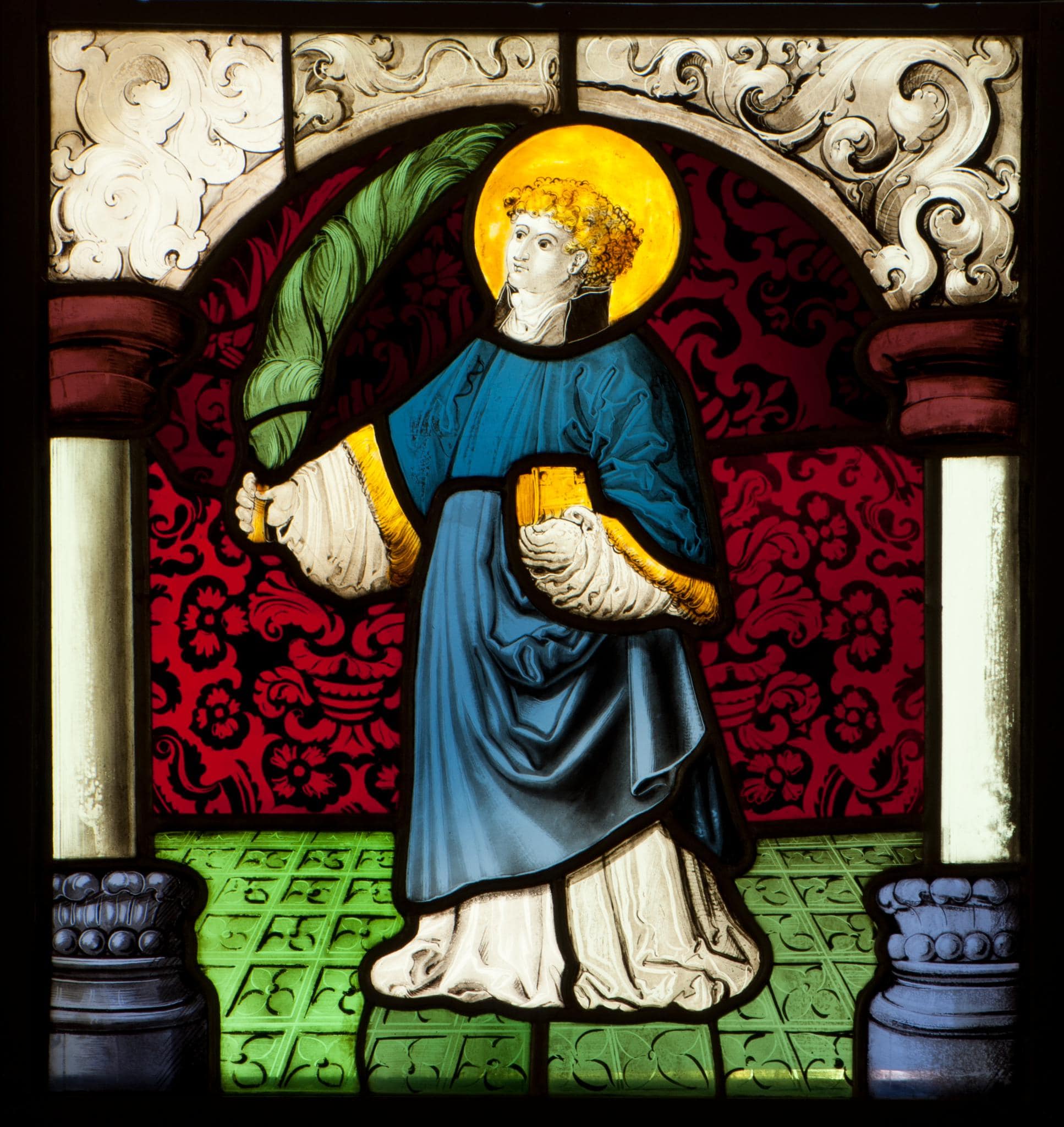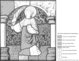 Die Scheibe bildet das Pendant zu derjenigen mit der Madonna. Wie diese besass sie ursprünglich vermutlich rote an Stelle ihrer ergänzten violetten Pfeilerbasen.