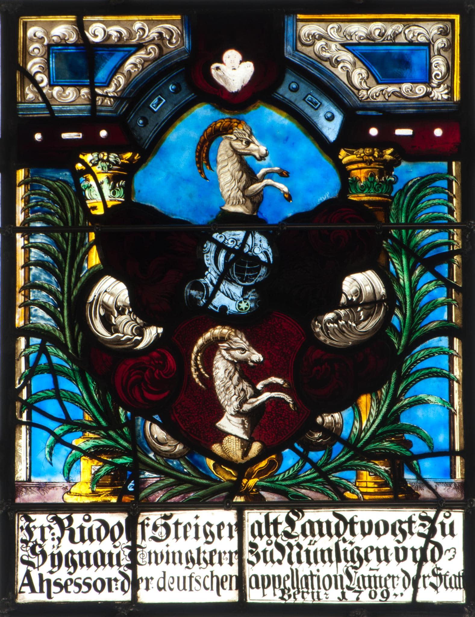 Hasler, R., & Keller, S. (2016). Wappenscheibe (Hans) Rudolf Steiger. Dans Vitrosearch. Consulté le 5 décembre 2025 de https://www.vitrosearch.ch/objects/2466397.