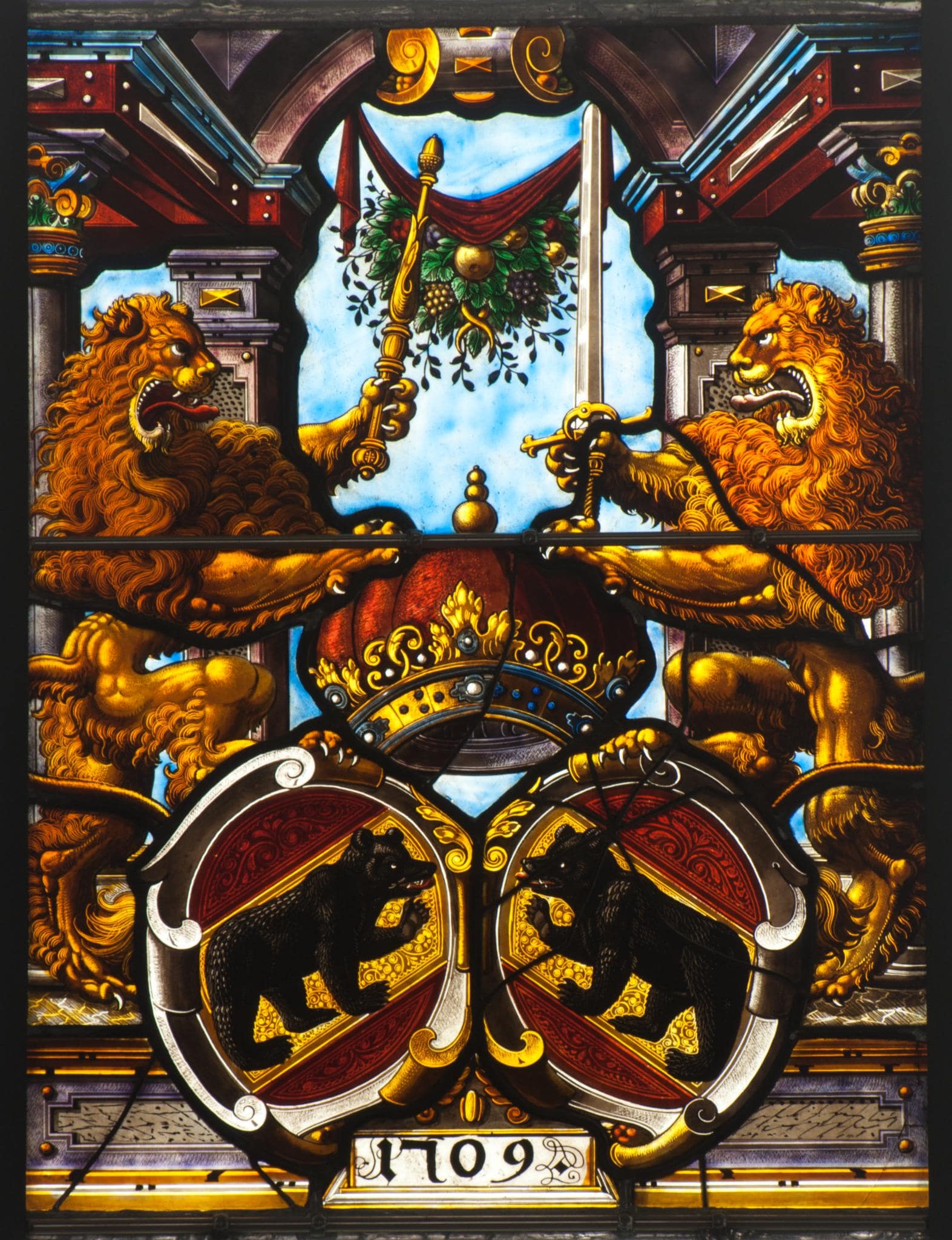 Die beiden in Rollwerkkartuschen gesetzten Bernschilde werden von einer Erlauchtkrone überhöht. Sie ruhen auf dem kleinen, mit dem Stiftungsjahr versehenen Sockel, der dem Podium am Scheibenfuss vorgelagert ist. Als Schildbegleiter fungieren zwei prächtige, auf dem Podium stehende Löwen, die in ihrer Vorderpranke ein Zepter (Schultheissenstab) beziehungsweise ein Schwert (Richtschwert) als Zeichen von Berns Staatsmacht empor halten. Hinter ihnen erhebt sich vor hellblauem, wolkigem Grund ein nach hinten fluchtendes dreiachsiges Rahmengehäuse, von dessen zentralem Flachbogen eine rote Stoffgirlande mit einem Fruchtbouquet herabhängt.