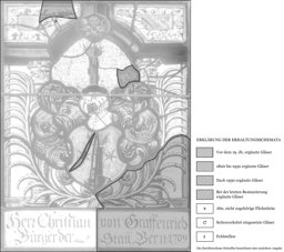 Der untere Teil des rechten Palmzweiges mit dem Inschriftenteil darunter, ein Stück im Blattgrund rechts neben der Helmzier, ein Randstück oben links sowie ein kleines Stück im Wappen neu ergänzt; ein altes Flickstück oben links; ein Sprung und mehrere Sprungbleie; die Verbleiung erneuert.