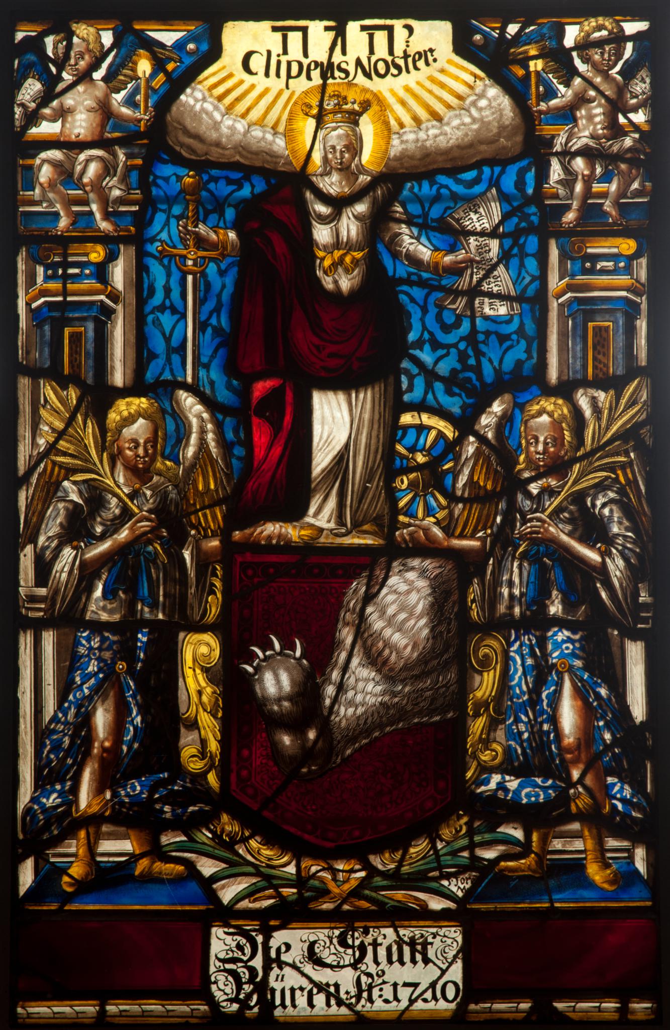 Den in einer gelben Kartusche auf zwei Palmwedel gesetzten Wappenschild der Stadt Büren begleiten zwei auf dem Podium mit der Stifterinschrift stehende Engel. Jeder der beiden Schildwächter ist in ein blaues Gewand gekleidet und hält in seiner Hand einen Palmzweig. Ihnen ist als weitere Begleiterin die hl. Katharina, Patronin der Kirche Bürens, beigesellt. In ein weisses Gewand und einen roten Umhang gehüllt, ist sie gekrönten Hauptes vor blauem Damastgrund auf dem Wappenschild postiert. Wie üblich sind ihr als Attribute die Marterwerkzeuge beigegeben, das heisst das Schwert in ihrer Rechten und das Rad zu ihren Füssen. Zudem hält sie in ihrer Linken ein Schriftband mit einem Heilspruch. Seelenheil verkündet ebenfalls der Spruch, der über der Heiligen im strahlenden Gotteslicht festgehalten ist. Hinter den Figuren erhebt sich eine Rahmenarchitektur aus Pfeilern und einem Flachbogen, zu dessen Seiten je ein Engelsknabe mit einer Kerze in der Hand sitzt.